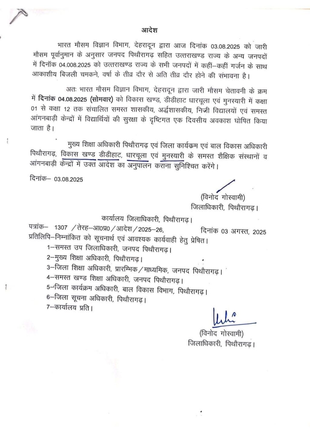 अतः भारत मौसम विज्ञान विभाग, देहरादून द्वारा जारी मौसम चेतावनी के क्रम में दिनांक 04.08.2025 (सोमवार) को विकास खण्ड, डीडीहाट धारचूला एवं मुनस्यारी में कक्षा 01 से कक्षा 12 तक संचालित समस्त शासकीय, अर्द्धशासकीय, निजी विद्यालयों एवं समस्त आंगनबाड़ी केन्द्रों में विद्यार्थियों की सुरक्षा के दृष्टिगत एक दिवसीय अवकाश घोषित किया जाता है।