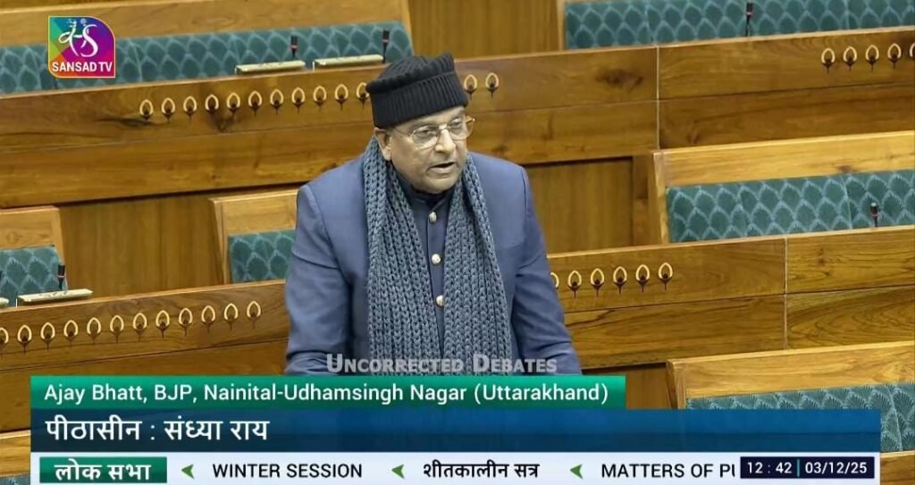 नैनीताल: पूर्व केंद्रीय राज्य मंत्री और नैनीताल–उधम सिंह नगर संसदीय क्षेत्र के सांसद अजय भट्ट ने लोकसभा के शून्यकाल में उत्तराखंड में हॉर्टीकल्चर टूरिज्म को बढ़ावा देने का मुद्दा प्रमुखता से उठाया।