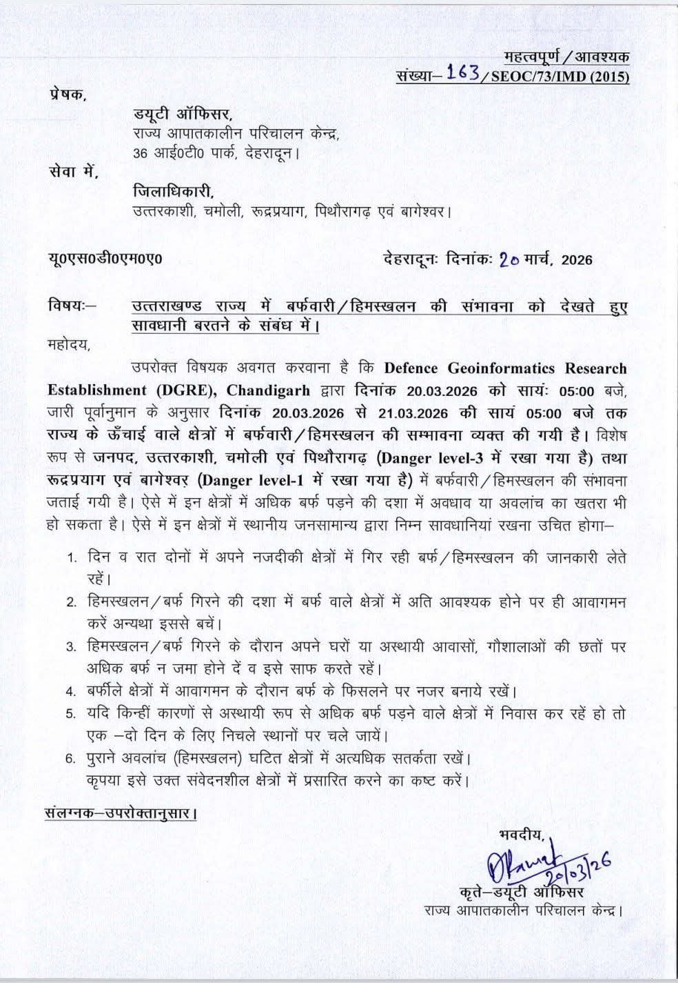 उत्तराखंड-/ बर्फबारी व हिमस्खलन की संभावना के मद्देनजर राज्य आपातकालीन परिचालन केन्द्र, देहरादून द्वारा उत्तरकाशी, चमोली, रूद्रप्रयाग, पिथौरागढ़ एवं बागेश्वर के जिलाधिकारियों को विशेष सावधानी बरतने के संबंध में जारी किए गए आदेश।