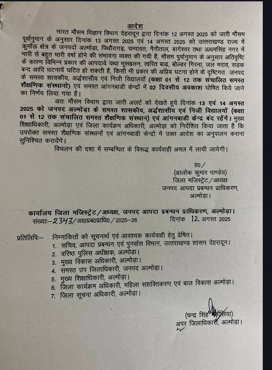 अतः मौसम विभाग द्वारा जारी अलर्ट को देखते हुये दिनांक 13 एवं 14 अगस्त 2025 को जनपद अल्मोड़ा के समस्त शासकीय, अर्द्धशासीय एवं निजी विद्यालयों (कक्षा 01 से 12 तक संचालित समस्त शैक्षणिक संस्थान) एवं आंगनबाडी केन्द्र बंद रहेंगे। मुख्य शिक्षाधिकारी, अल्मोड़ा एवं जिला कार्यक्रम अधिकारी, अल्मोड़ा को निर्देशित किया जाता है कि उपरोक्त समस्त शैक्षणिक संस्थानों एवं आंगनबाडी केन्द्रो में उक्त आदेश का अनुपालन कराना सुनिश्चित करायेंगे।