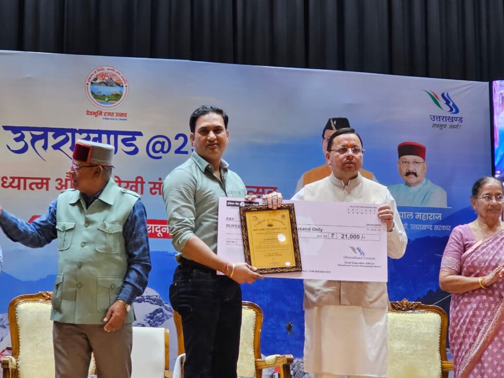 देहरादून: उत्तराखंड स्थापना दिवस के रजत जयंती महोत्सव के अवसर पर पर्यटन विभाग द्वारा आयोजित कार्यक्रम में अरुणोदय होम स्टे, जंगलिया गांव (भीमताल), नैनीताल को राज्य में सर्वोच्च स्थान मिलने पर मुख्यमंत्री पुष्कर सिंह धामी ने संचालक उमंग वासुदेव को सम्मानित किया। इस मौके पर मुख्यमंत्री ने उन्हें मोमेंटो और 21,000 रुपए का चेक प्रदान किया।