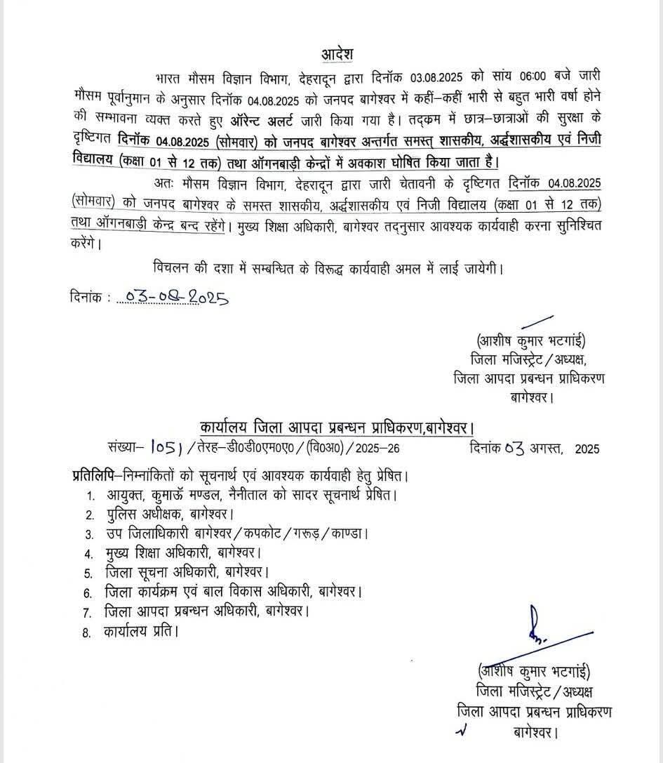 भारत मौसम विज्ञान विभाग, देहरादून द्वारा दिनाँक 03.08.2025 को सांय 06:00 बजे जारी मौसम पूर्वानुमान के अनुसार दिनाँक 04.08.2025 को जनपद बागेश्वर में कहीं-कहीं भारी से बहुत भारी वर्षा होने की सम्भावना व्यक्त करते हुए ऑरेन्ट अलर्ट जारी किया गया है। तद्धम में छात्र-छात्राओं की सुरक्षा के दृष्टिगत दिनाँक 04.08.2025 (सोमवार) को जनपद बागेश्वर अन्तर्गत समस्त् शासकीय, अर्द्धशासकीय एवं निजी विद्यालय (कक्षा 01 से 12 तक) तथा आँगनबाड़ी केन्द्रों में अवकाश घोषित किया जाता है।
