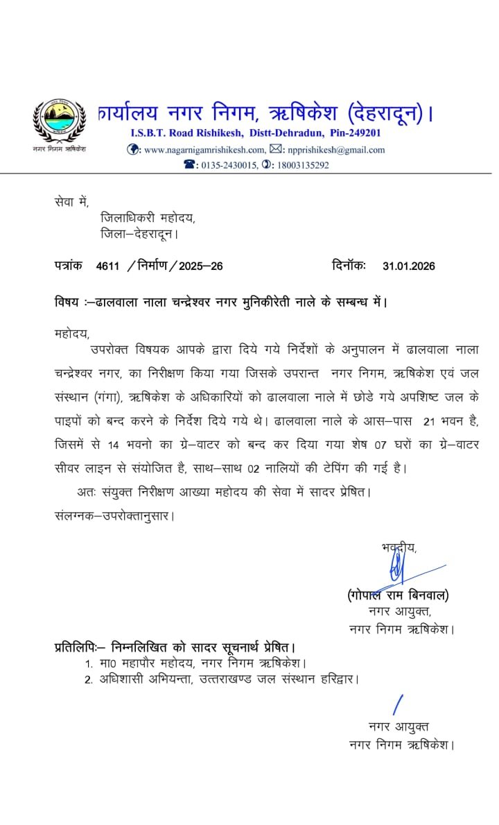 संयुक्त निरीक्षण के उपरांत जल संस्थान ऋषिकेश द्वारा नाले में ग्रे-वाटर प्रवाहित कर रहे 14 भवनों के स्वामियों को नोटिस जारी किए गए तथा मौके पर ही उनके भवनों से नाले में जाने वाली अपशिष्ट जल निकासी को बंद कर दिया गया। इसके अतिरिक्त, जिलाधिकारी द्वारा दिए गए निर्देशों के क्रम में नगर निगम एवं जल संस्थान द्वारा क्षेत्र की 02 नालियों की भी टेपिंग कर दी गई है।