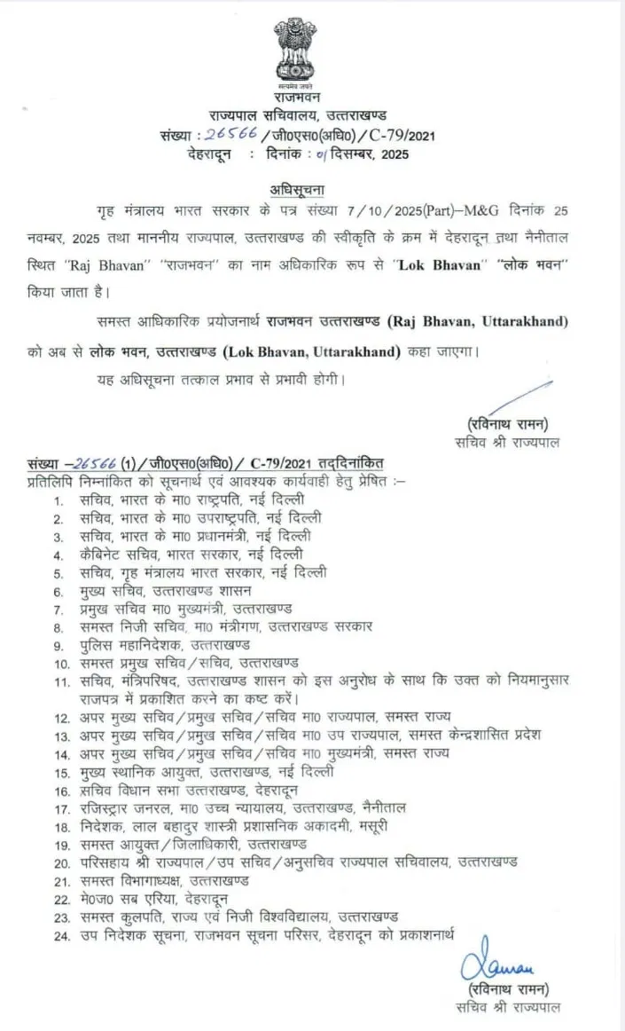 देहारादून: उत्तराखंड सरकार ने ऐतिहासिक निर्णय लिया है। अब देहरादून और नैनीताल स्थित राजभवन को “लोक भवन” के नाम से जाना जाएगा। राजभवन सचिवालय की ओर से इसका आधिकारिक आदेश जारी कर दिया गया है।