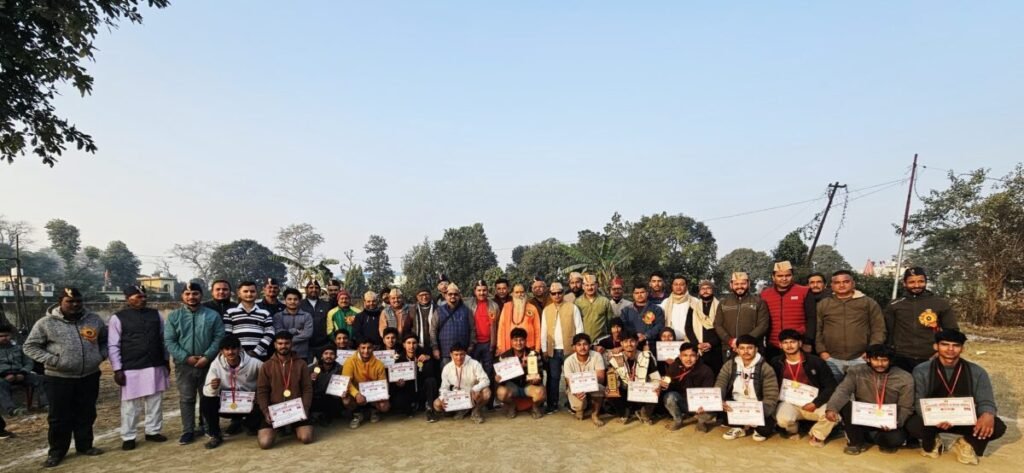 फोटो परिचय- वॉलीबॉल फाइनल मुकाबले के विजेता व उपविजेता टीमों को पुरस्कार प्रदान करते मुख्य अतिथि महामंडलेश्वर सोमेश्वर यति जी महाराज, विशिष्ट अतिथि जीवन कबड़वाल, मेला समिति के पदाधिकारी एवं क्षेत्रवासी।