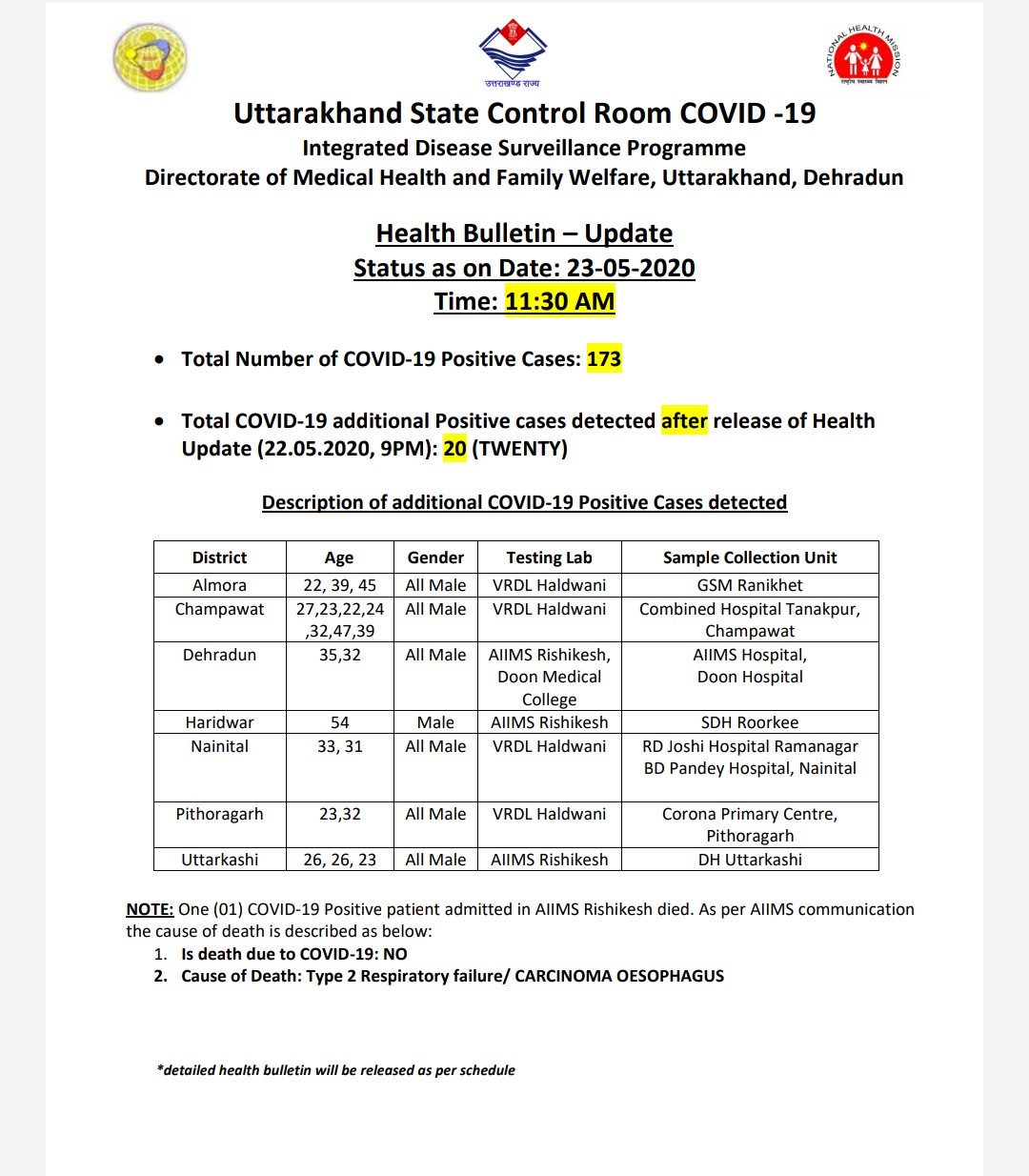 उत्तराखंड में शनिवार को कोरोनावायरस ने दोपहर तक ही अपने सारे रिकॉर्ड तोड़ दिए स्वास्थ्य विभाग द्वारा 11:30 बजे के हेल्थ बुलेटिन के दौरान 20 लोगों को राज्य में कोरोनावायरस कोविड-19 से संक्रमित पाए जाने की खबर मिली जिसमें से अल्मोड़ा में तीन, चंपावत में सात, देहरादून में दो, हरिद्वार में एक, नैनीताल में दो, पिथौरागढ़ में दो, उत्तरकाशी में तीन, लोग कोरोना संक्रमित पाए गए हैं।