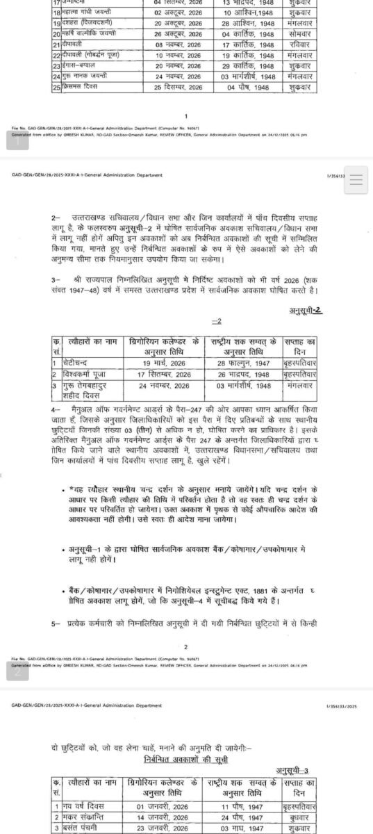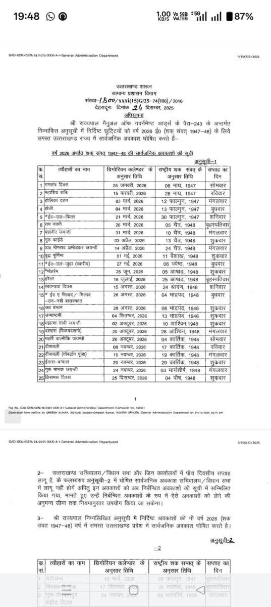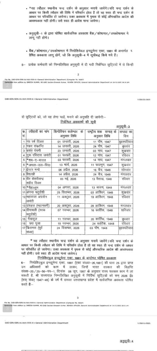 देहरादून:(बड़ी खबर) 2026 की हॉलिडे लिस्ट जारी, इतनी रहेंगी छुट्टियां
