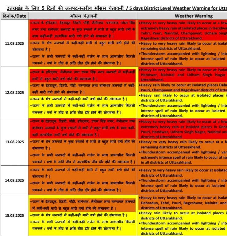 देहरादून, टिहरी, पौड़ी, चंपावत,और बागेश्वर जिले में भारी बारिश की चेतावनी
