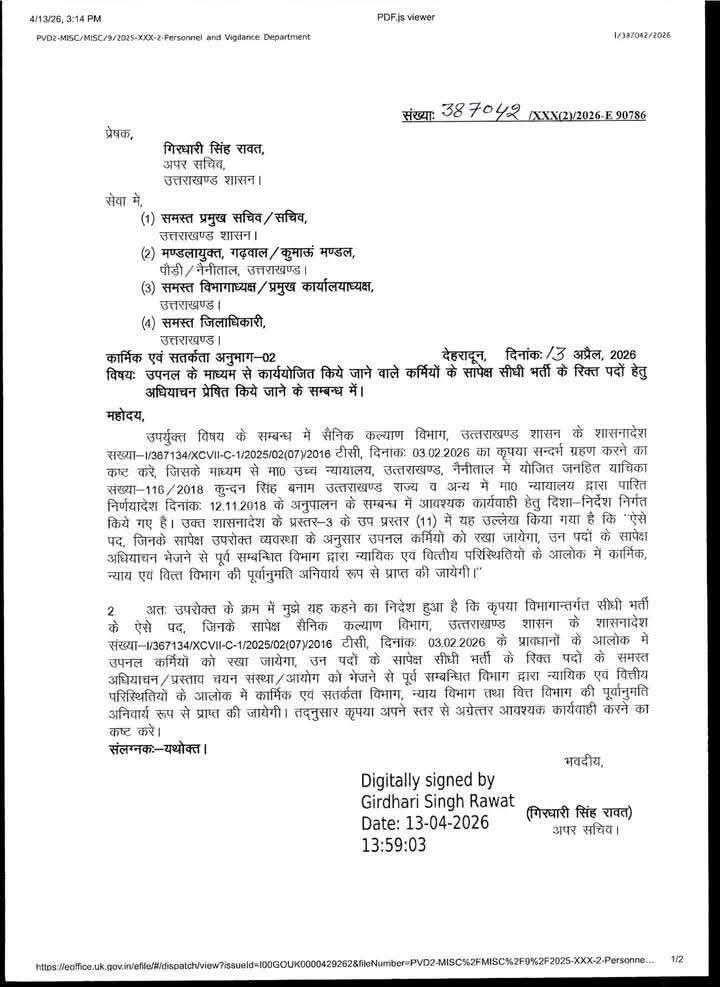 उपनल के माध्यम से कार्ययोजित किये जाने वाले कर्मियों के सापेक्ष सीधी भर्ती के रिक्त पदों हेतु अधियाचन प्रेषित किये जाने के सम्बन्ध में।महोदय,उपर्युक्त विषय के सम्बन्ध में सैनिक कल्याण विभाग, उत्तराखण्ड शासन के शासनादेश सख्या-1/387134/XCVII-C-1/2025/02 (07)/2016 टीसी, दिनाकः 03.02.2026 का कृपया सन्दर्भ ग्रहण करने का कष्ट करें, जिसके माध्यम से मा० उच्च न्यायालय, उत्तराखण्ड, नैनीताल में योजित जनहित याचिका संख्या-116/2018 कुन्दन सिंह बनाम उत्तराखण्ड राज्य व अन्य में मा० न्यायालय द्वारा पारित निर्णयादेश दिनांकः 12.11.2018 के अनुपालन के सम्बन्ध में आवश्यक कार्यवाही हेतु दिशा-निर्देश निर्गत किये गए है। उक्त शासनादेश के प्रस्तर-3 के उप प्रस्तर (11) में यह उल्लेख किया गया है कि “ऐसे पद, जिनके सापेक्ष उपरोक्त व्यवस्था के अनुसार उपनल कर्मियों को रखा जायेगा, उन पदों के सापेक्ष अधियाचन भेजने से पूर्व सम्बन्धित विभाग द्वारा न्यायिक एव वित्तीय परिस्थितियों के आलोक में कार्मिक, न्याय एवं वित्त विभाग की पूर्वानुमति अनिवार्य रूप से प्राप्त की जायेगी।”2 अतः उपरोक्त के क्रम में मुझे यह कहने का निदेश हुआ है कि कृपया विभागान्तर्गत सीधी भर्ती के ऐसे पद, जिनके सापेक्ष सैनिक कल्याण विभाग, उत्तराखण्ड शासन के शासनादेश संख्या-1/367134/XCVII-C-1/2025/02(07)/2016 टीसी, दिनांक 03.02.2026 के प्रावधानों के आलोक में उपनल कर्मियों को रखा जायेगा, उन पदों के सापेक्ष सीधी भर्ती के रिक्त पदों के समस्त अधियाचन / प्रस्ताव चयन संस्था/आयोग को भेजने से पूर्व सम्बन्धित विभाग द्वारा न्यायिक एवं वित्तीय परिस्थितियों के आलोक में कार्मिक एवं सतर्कता विभाग, न्याय विभाग तथा वित्त विभाग की पूर्वानुमति अनिवार्य रूप से प्राप्त की जायेगी। तद्नुसार कृपया अपने स्तर से अग्रेत्तर आवश्यक कार्यवाही करने का कष्ट करें।संलग्नकः यथोक्त ।