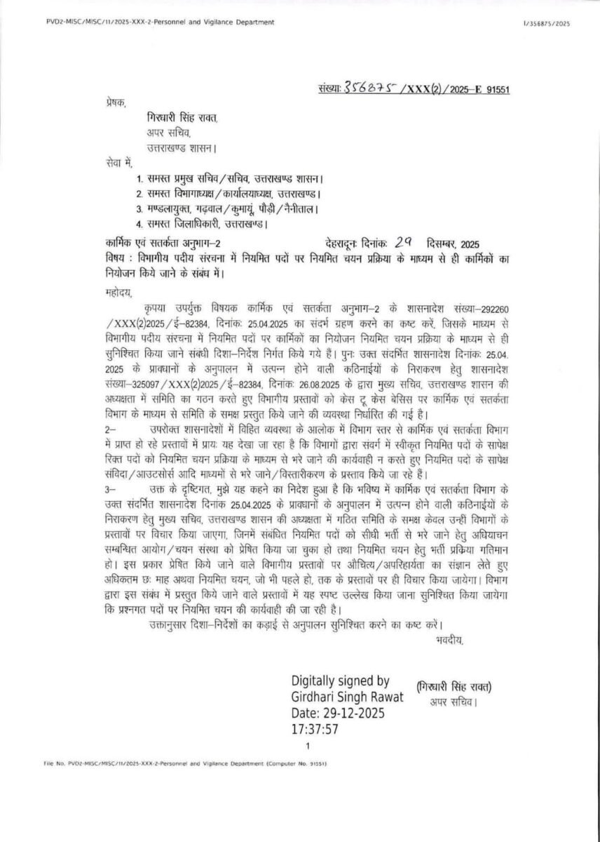 कृपया उपर्युक्त विषयक कार्मिक एवं सतर्कता अनुभाग-2 के शासनादेश संख्या-292260 /XXX(2)2025/ई-82384, दिनांक: 25.04.2025 का संदर्भ ग्रहण करने का कष्ट करें, जिसके माध्यम से विभागीय पदीय संरचना में नियमित पदों पर कार्मिकों का नियोजन नियमित चयन प्रक्रिया के माध्यम से ही सुनिश्चित किया जाने संबंधी दिशा-निर्देश निर्गत किये गये हैं। पुनः उक्त संदर्भित शासनादेश दिनांक 25.04. 2025 के प्रावधानों के अनुपालन में उत्पन्न होने वाली कठिनाईयों के निराकरण हेतु शासनादेश संख्या-325097/XXX (2) 2025/ई-82384, दिनांकः 26.08.2025 के द्वारा मुख्य सचिव, उत्तराखण्ड शासन की अध्यक्षता में समिति का गठन करते हुए विभागीय प्रस्तावों को केस टू केस बेसिस पर कार्मिक एवं सतर्कता विभाग के माध्यम से समिति के समक्ष प्रस्तुत किये जाने की व्यवस्था निर्धारित की गई है।