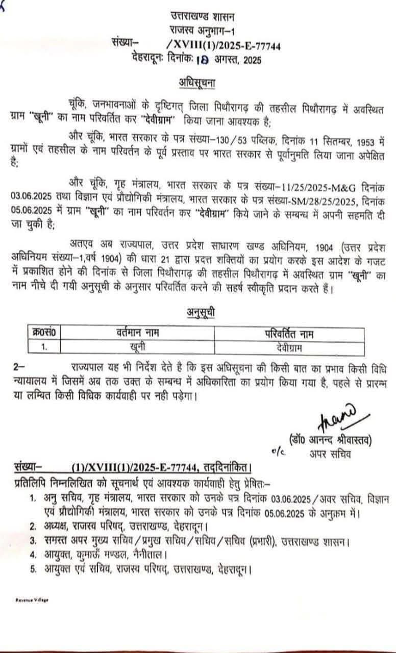 देहरादून: चूंकि, जनभावनाओं के दृष्टिगत् जिला पिथौरागढ़ की तहसील पिथौरागढ़ में अवस्थित ग्राम “खूनी” का नाम परिवर्तित कर “देवीग्राम” किया जाना आवश्यक है;