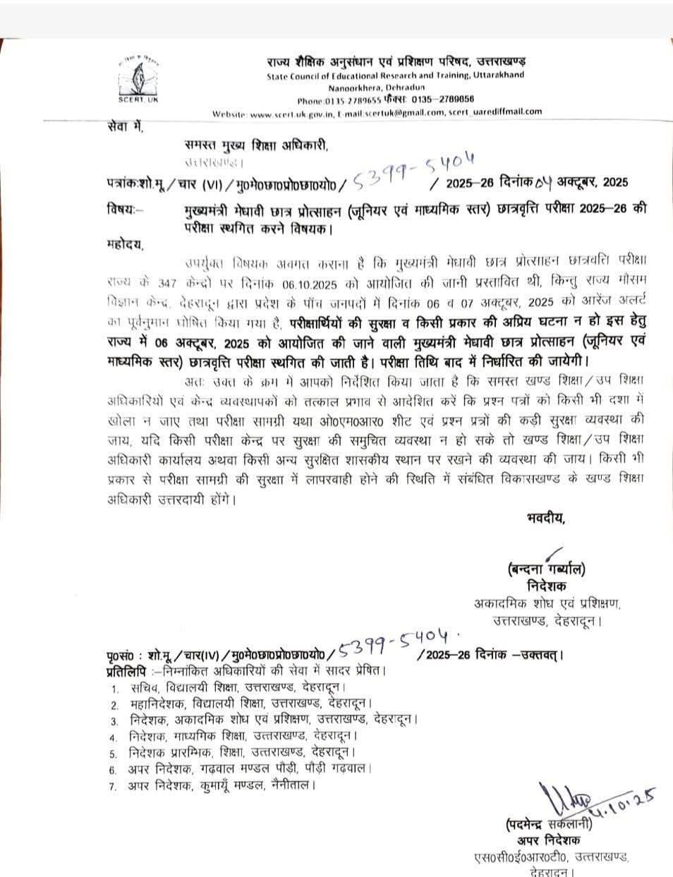 उपर्युक्त विषयक अवगत कराना है कि मुख्यमंत्री मेधावी छात्र प्रोत्साहन छात्रवत्ति परीक्षा राज्य के 347 केन्द्रो पर दिनांक 06.10.2025 को आयोजित की जानी प्रस्तावित थी, किन्तु राज्य मौसम विज्ञान केन्द्र, देहरादून द्वारा प्रदेश के पाँच जनपदों में दिनांक 06 व 07 अक्टूबर, 2025 को आरेंज अलर्ट का पूर्वनुमान घोषित किया गया है, परीक्षार्थियों की सुरक्षा व किसी प्रकार की अप्रिय घटना न हो इस हेतु राज्य में 06 अक्टूबर, 2025 को आयोजित की जाने वाली मुख्यमंत्री मेधावी छात्र प्रोत्साहन (जूनियर एवं माध्यमिक स्तर) छात्रवृत्ति परीक्षा स्थगित की जाती है। परीक्षा तिथि बाद में निर्धारित की जायेगी।