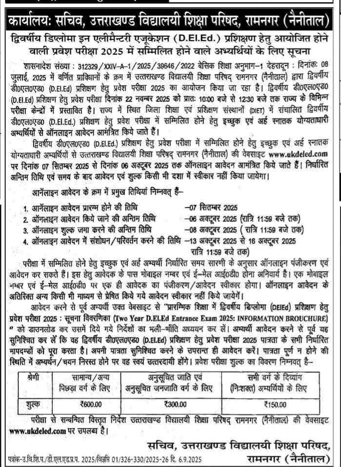 द्विवर्षीय डी०एल०एड० (D.El.Ed.) प्रशिक्षण हेतु प्रवेश परीक्षा में सम्मिलित होने हेतु इच्छुक एवं अर्ह स्नातक योग्यताधारी अभ्यर्थियों से उत्तराखण्ड विद्यालयी शिक्षा परिषद् रामनगर (नैनीताल) की वेवसाइट www.ukdeled.com पर दिनांक 07 सितम्बर 2025 से दिनांक 06 अक्टूबर 2025 तक ऑनलाइन आवेदन आमंत्रित किये जाते हैं। निर्धारित अन्तिम तिथि एवं समय के बाद आवेदन एवं शुल्क किसी भी दशा में स्वीकार नहीं किया जायेगा।
