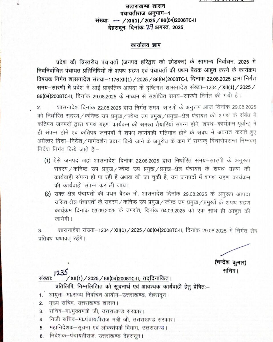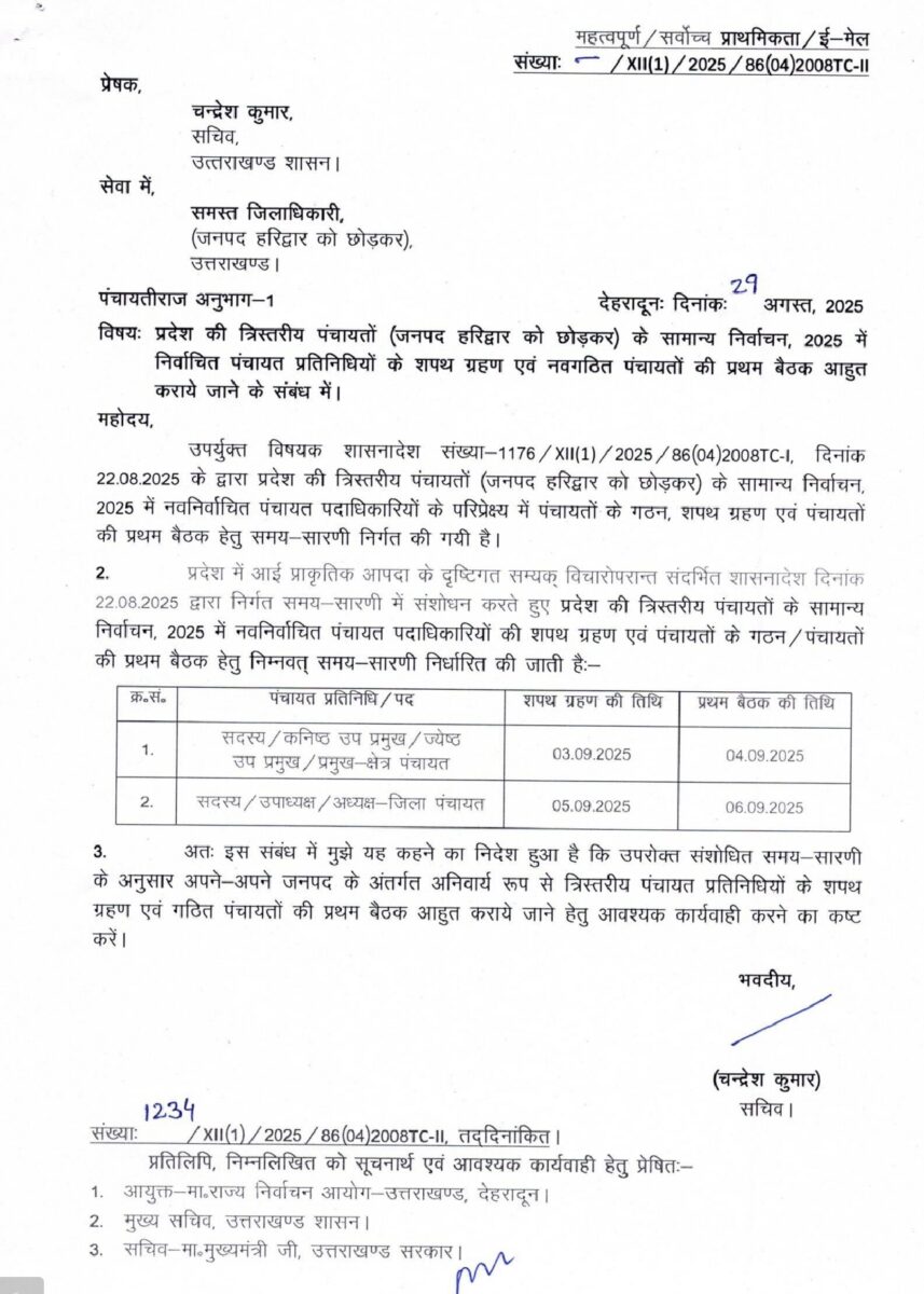 उपर्युक्त विषयक शासनादेश संख्या-1176/XII(1)/2025/86(04) 2008TC-1, दिनांक 22.08.2025 के द्वारा प्रदेश की त्रिस्तरीय पंचायतों (जनपद हरिद्वार को छोड़कर) के सामान्य निर्वाचन, 2025 में नवनिर्वाचित पंचायत पदाधिकारियों के परिप्रेक्ष्य में पंचायतों के गठन, शपथ ग्रहण एवं पंचायतों की प्रथम बैठक हेतु समय-सारणी निर्गत की गयी है।