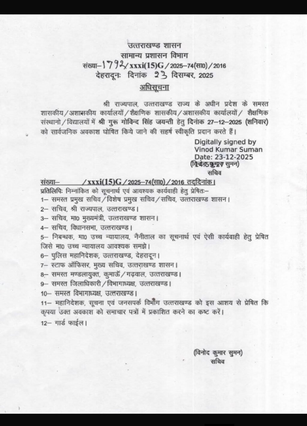 श्री राज्यपाल, उत्तराखण्ड राज्य के अधीन प्रदेश के समस्त शासकीय/अशासकीय कार्यालयों / शैक्षणिक शासकीय/अशासकीय कार्यालयों / शैक्षणिक संस्थानो / विद्यालयों में श्री गुरू गोविन्द सिंह जयन्ती हेतु दिनांक 27-12-2025 (शनिवार) को सार्वजनिक अवकाश घोषित किये जाने की सहर्ष स्वीकृति प्रदान करते हैं