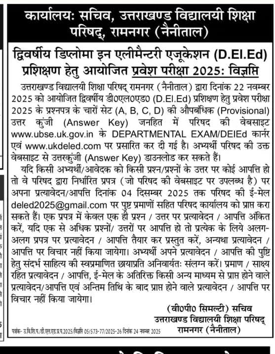 उत्तराखण्ड विद्यालयी शिक्षा परिषद् रामनगर (नैनीताल) द्वारा दिनांक 22 नवम्बर 2025 को आयोजित द्विवर्षीय डी०एल०एड० (D.El.Ed) प्रशिक्षण हेतु प्रवेश परीक्षा 2025 के प्रश्नपत्र के चारों सेट (A, B, C, D) की औपबंधिक (Provisional) उत्तर कुंजी (Answer Key) जनहित में परिषद की वेबसाइट www.ubse.uk.gov.in के DEPARTMENTAL EXAM/DEIEd कार्नर एवं www.ukdeled.com पर प्रसारित कर दी गई है। अभ्यर्थी परिषद की उक्त वेबसाइट से उत्तरकुंजी (Answer Key) डाउनलोड कर सकते हैं।
