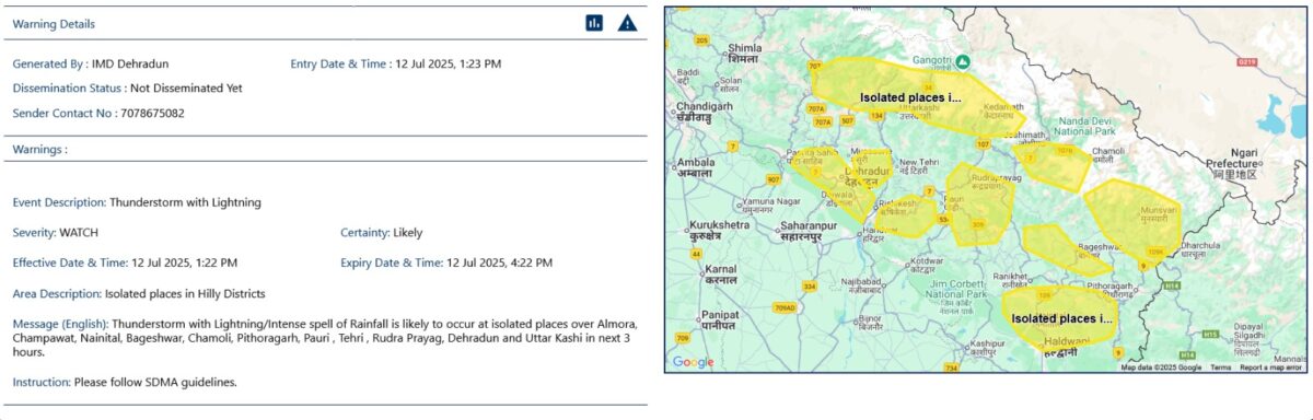 अगले 03 घंटों में (येल्लो अलर्ट दिनांक 12 .7.2025, 1:22 PM बजे से 12.7.2025, 4:22 PM बजे तक ) जनपद– अल्मोडा, चंपावत, नैनीताल, बागेश्वर, चमोली, पिथौरागढ, पौडी, टेहरी, रूद्र प्रयाग, देहरादून और उत्तर काशी में अलग-अलग स्थानों पर यथा – मुनस्यारी, डोईवाला, देवप्रयाग, कर्णप्रयाग, कौसानी, मुक्तेश्वर, केदारनाथ तथा इसके आस पास के क्षेत्रों में बिजली कड़कने के साथ गरज के साथ तूफान/तेज बारिश होने की संभावना है |