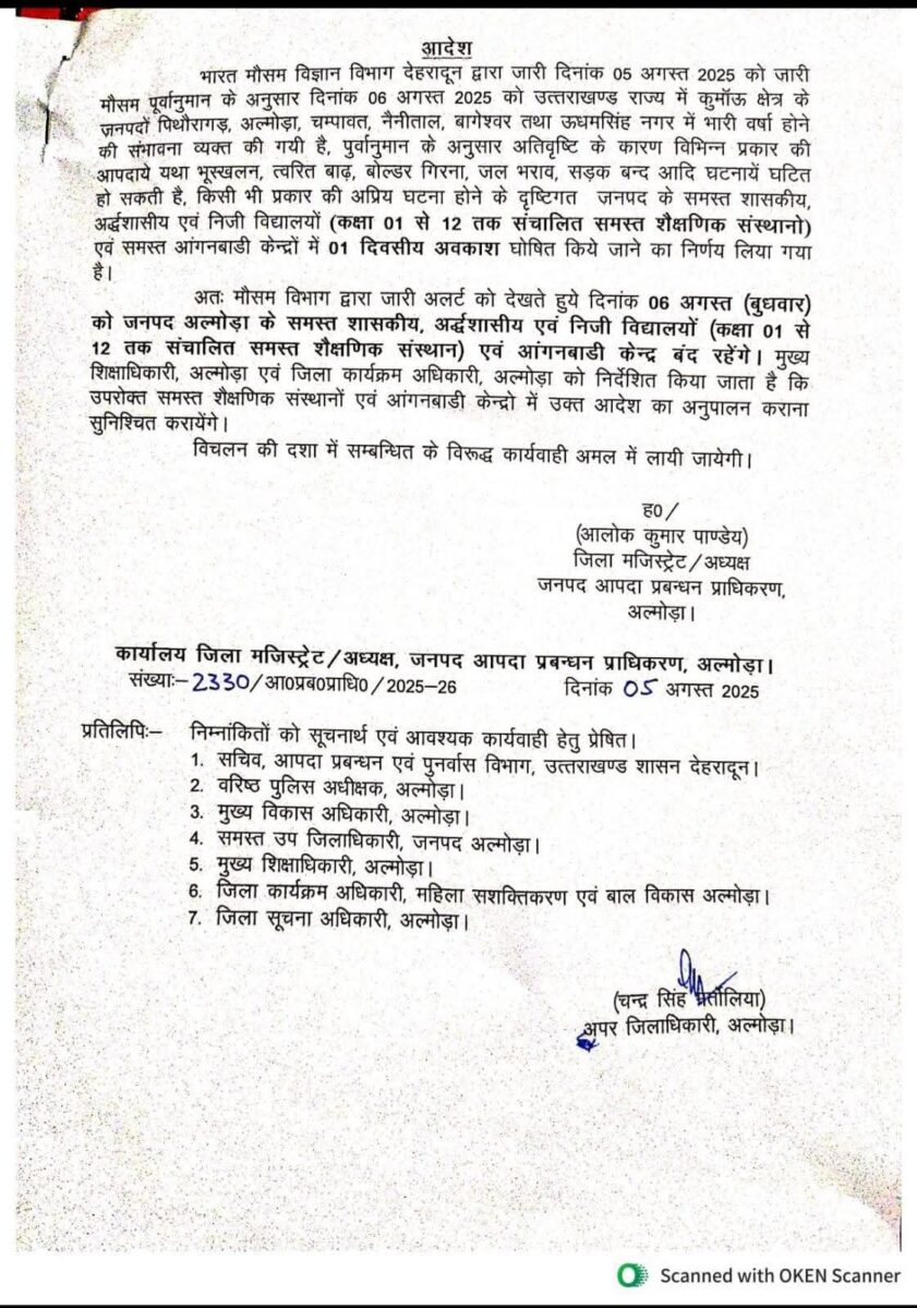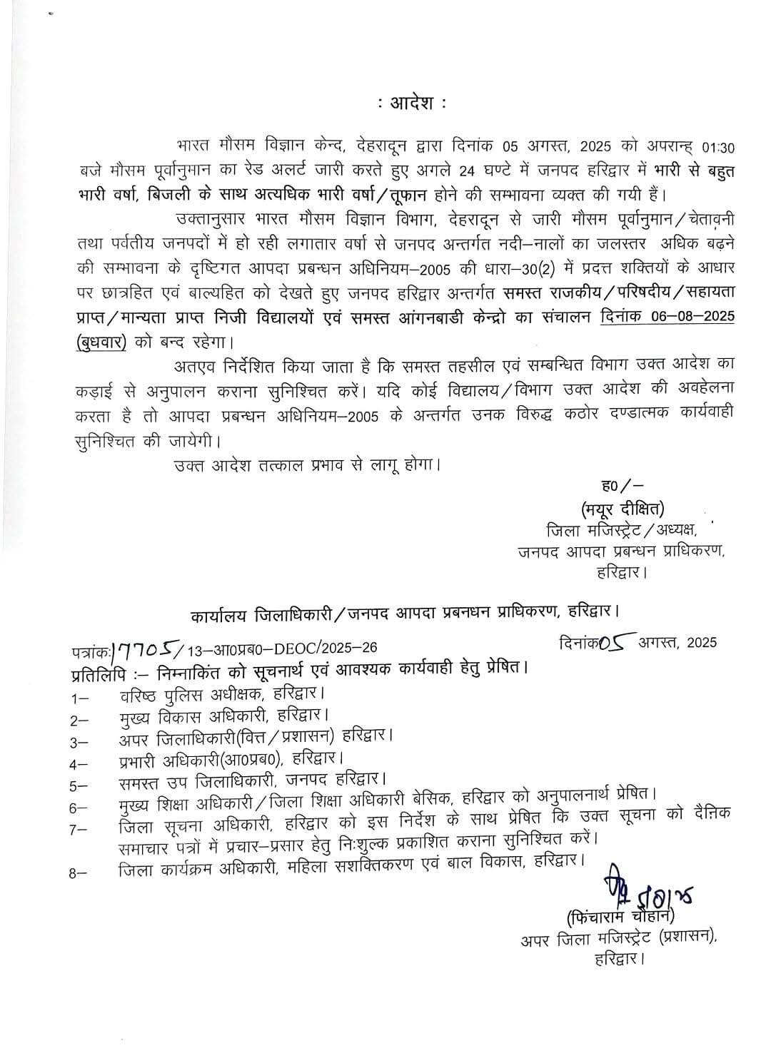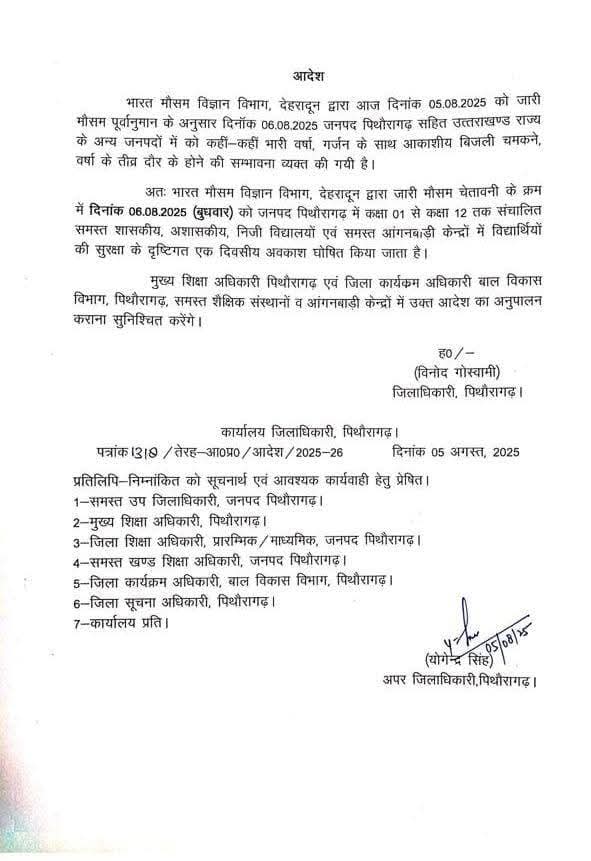 उत्तराखंड में कल बुधवार को भारी बारिश की चेतावनी के चलते आज उत्तरकाशी उधम सिंह नगर हरिद्वार अल्मोड़ा और पिथौरागढ़ जिले में अब तक छुट्टी जारी कर दी है