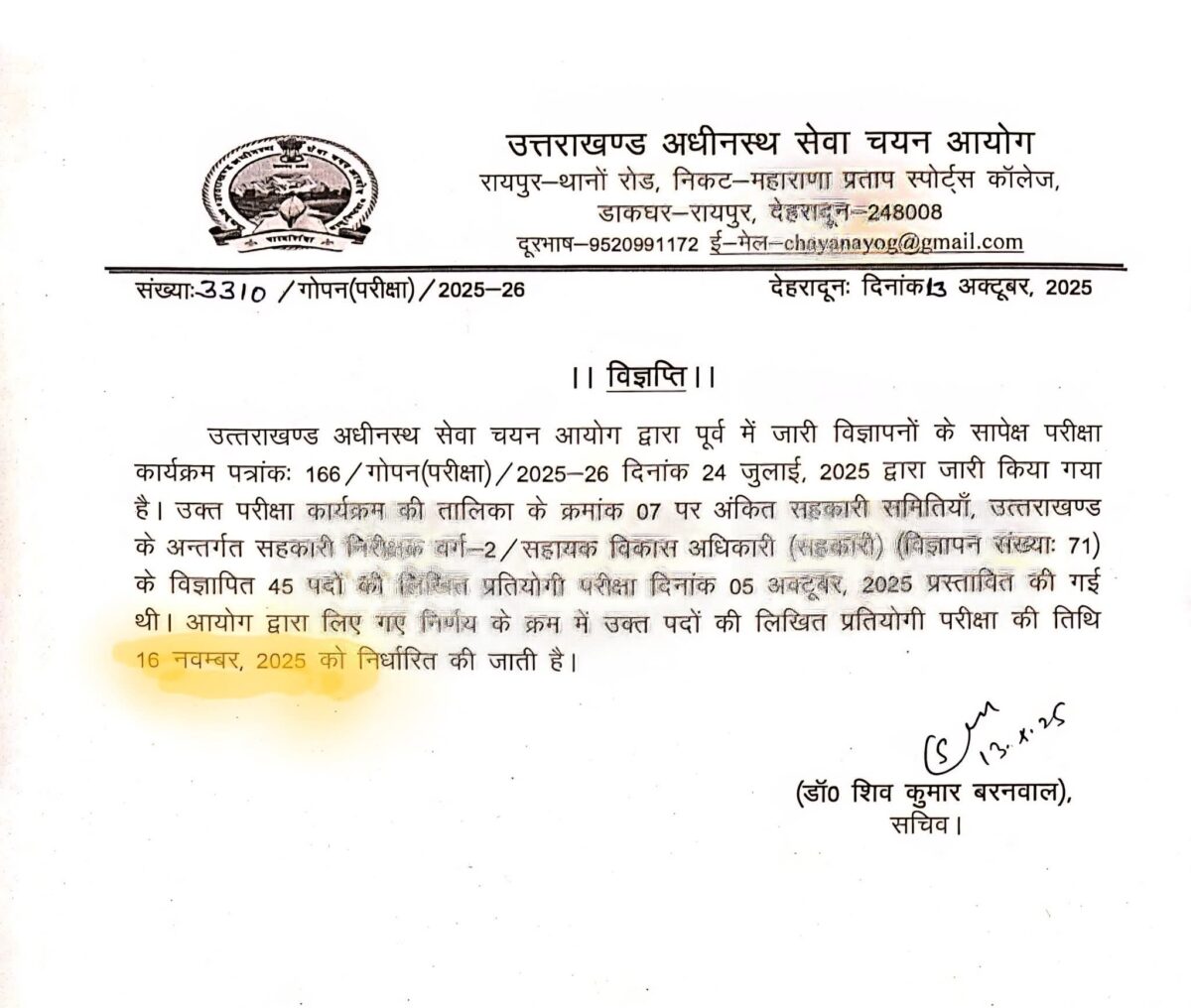 उत्तराखण्ड अधीनस्थ सेवा चयन आयोग द्वारा पूर्व में जारी विज्ञापनों के सापेक्ष परीक्षा कार्यक्रम पत्रांकः 166 / गोपन (परीक्षा) / 2025-26 दिनांक 24 जुलाई, 2025 द्वारा जारी किया गया है। उक्त परीक्षा कार्यक्रम की तालिका के क्रमांक 07 पर अंकित सहकारी समितियाँ, उत्तराखण्ड के अन्तर्गत सहकारी निरीक्षक वर्ग-2/ सहायक विकास अधिकारी (सहकारी) (विज्ञापन संख्याः 71) के विज्ञापित 45 पदों की लिखित प्रतियोगी परीक्षा दिनांक 05 अक्टूबर, 2025 प्रस्तावित की गई थी। आयोग द्वारा लिए गए निर्णय के क्रम में उक्त पदों की लिखित प्रतियोगी परीक्षा की तिथि 16 नवम्बर, 2025 को निर्धारित की जाती है।