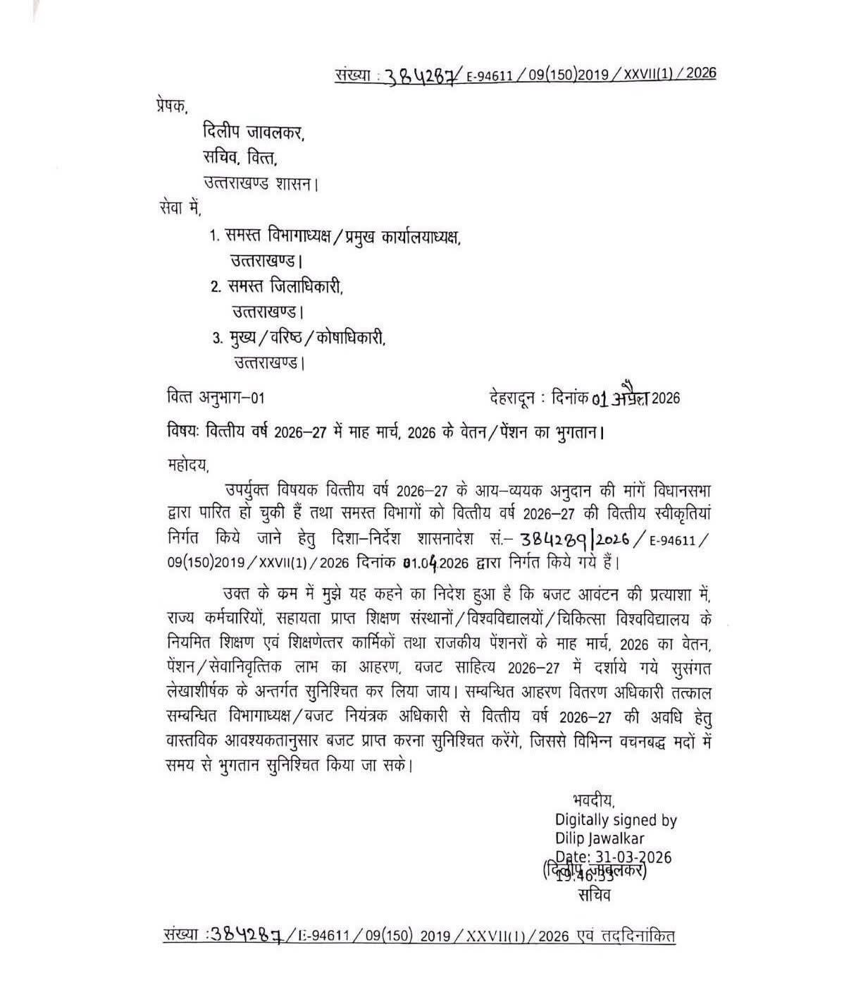 देहरादून :(बड़ी खबर) मार्च के वेतन, पेंशन को लेकर आदेश