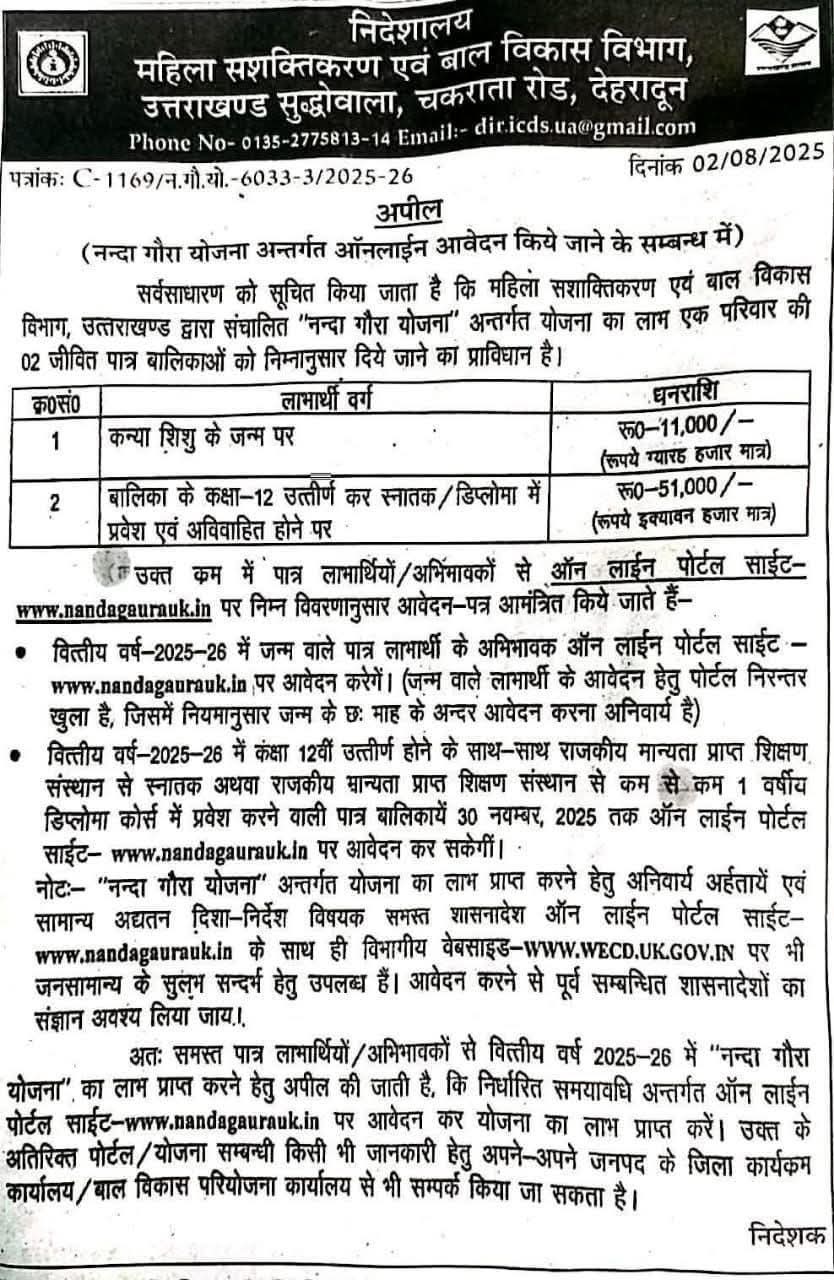 वित्तीय वर्ष-2025-26 में कंक्षा 12वीं उत्तीर्ण होने के साथ-साथ राजकीय मान्यता प्राप्त शिक्षण संस्थान से स्नातक अथवा राजकीय मान्यता प्राप्त शिक्षण संस्थान से कम से कम 1 वर्षीय डिप्लोमा कोर्स में प्रवेश करने वाली पात्र बालिकायें 30 नवम्बर, 2025 तक ऑन लाईन पोर्टल साईट- www.nandagaurauk.in पर आवेदन कर सकेगीं।