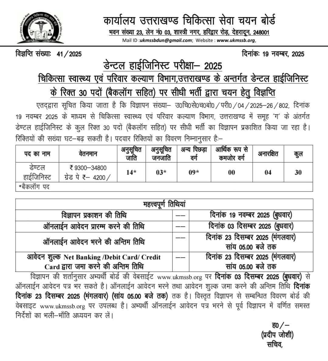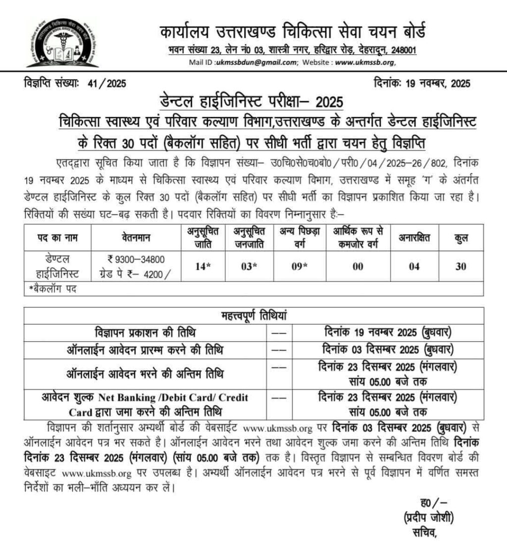 चिकित्सा स्वास्थ्य एवं परिवार कल्याण विभाग, उत्तराखण्ड के अन्तर्गत डेन्टल हाईजिनिस्ट के रिक्त पदों पर सीधी भर्ती हेतु विज्ञप्ति जारी।