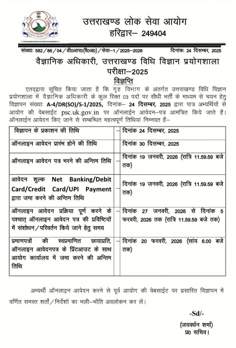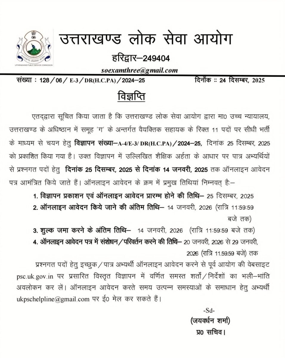 एतद्वारा सूचित किया जाता है कि उत्तराखण्ड लोक सेवा आयोग द्वारा मा० उच्च न्यायालय, उत्तराखण्ड के अधिष्ठान में समूह ‘ग’ के अन्तर्गत वैयक्तिक सहायक के रिक्त 11 पदों पर सीधी भर्ती के माध्यम से चयन हेतु विज्ञापन संख्या-A-4/E-3/DR(H.C.PA)/2024-25, दिनांक 25 दिसम्बर, 2025 को प्रकाशित किया गया है। उक्त विज्ञापन में उल्लिखित शैक्षिक अर्हता के आधार पर पात्र अभ्यर्थियों से प्रश्नगत पदों हेतु दिनांक 25 दिसम्बर, 2025 से दिनांक 14 जनवरी, 2025 तक ऑनलाइन आवेदन पत्र आमंत्रित किये जाते हैं। ऑनलाइन आवेदन के क्रम में प्रमुख तिथियां निम्नवत् हैः-