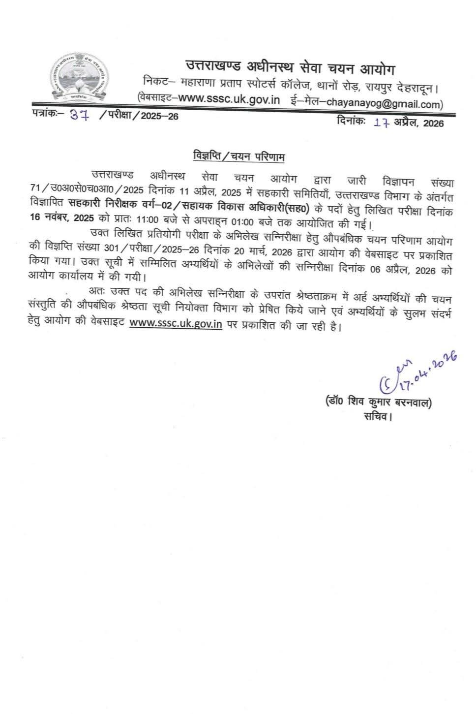 UKSSSC ने जारी किया पदनाम- #सहायकविकासअधिकारी /सहायक निरीक्षक वर्ग-2 का अंतिम परिणाम।
