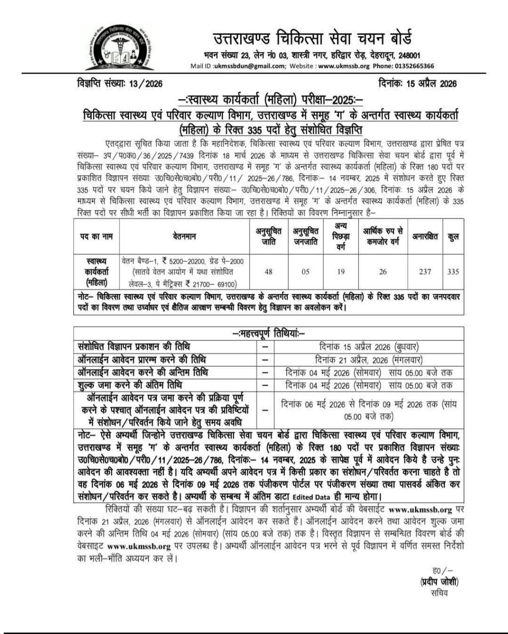 एतद्वारा सूचित किया जाता है कि महानिदेशक, चिकित्सा स्वास्थ्य एवं परिवार कल्याण विभाग, उत्तराखण्ड द्वारा प्रेषित पत्र संख्या- उप/प०क०/36/2025/7439 दिनांक 18 मार्च 2026 के माध्यम से उत्तराखण्ड चिकित्सा सेवा चयन बोर्ड द्वारा पूर्व में चिकित्सा स्वास्थ्य एवं परिवार कल्याण विभाग, उत्तराखण्ड में समूह ‘ग’ के अन्तर्गत स्वास्थ्य कार्यकर्ता (महिला) के रिक्त 180 पदों पर प्रकाशित विज्ञापन संख्याः उ० चि० से०च०बो०/ परी०/11/2025-26/786, दिनांक 14 नवम्बर, 2025 में संशोधन करते हुए रिक्त 335 पदों पर चयन किये जाने हेतु विज्ञापन संख्याः उ० चि० से०च०बो०/परी०/11/2025-26/306, दिनांकः 15 अप्रैल 2026 के माध्यम से चिकित्सा स्वास्थ्य एवं परिवार कल्याण विभाग, उत्तराखण्ड में समूह ‘ग’ के अन्तर्गत स्वास्थ्य कार्यकर्ता (महिला) के 335 रिक्त पदों पर सीधी भर्ती का विज्ञापन प्रकाशित किया जा रहा है। रिक्तियों का विवरण निम्नानुसार है-