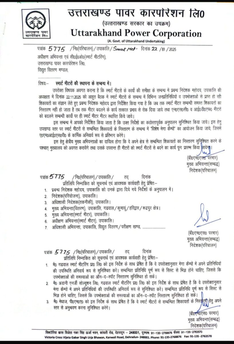 उपरोक्त विषयक अवगत कराना है कि स्मार्ट मीटरों के कार्यों की समीक्षा के सम्बन्ध में प्रबन्ध निदेशक महोदय, उपाकालि की अध्यक्षता में दिनांक 22.11.2025 को आहूत बैठक में स्मार्ट मीटरों के सम्बन्ध में विभिन्न जनप्रतिनिधियों व उपभोक्ताओं से प्राप्त हो रही शिकायतों का संज्ञान लेते हुए प्रबन्ध निदेशक महोदय द्वारा निर्देशित किया गया है कि जब तक स्मार्ट मीटर सम्बन्धी समस्त शिकायतों का निस्तारण नहीं हो जाता है तब तक मीटर बदलने के कार्य तत्काल प्रभाव से रोक दिया जाये तथा एन०एस०सी० व आई०डी०एफ० मीटरों को बदलने सम्बन्धी कार्यों पर ही स्मार्ट मीटर मीटर स्थापित किये जाये।