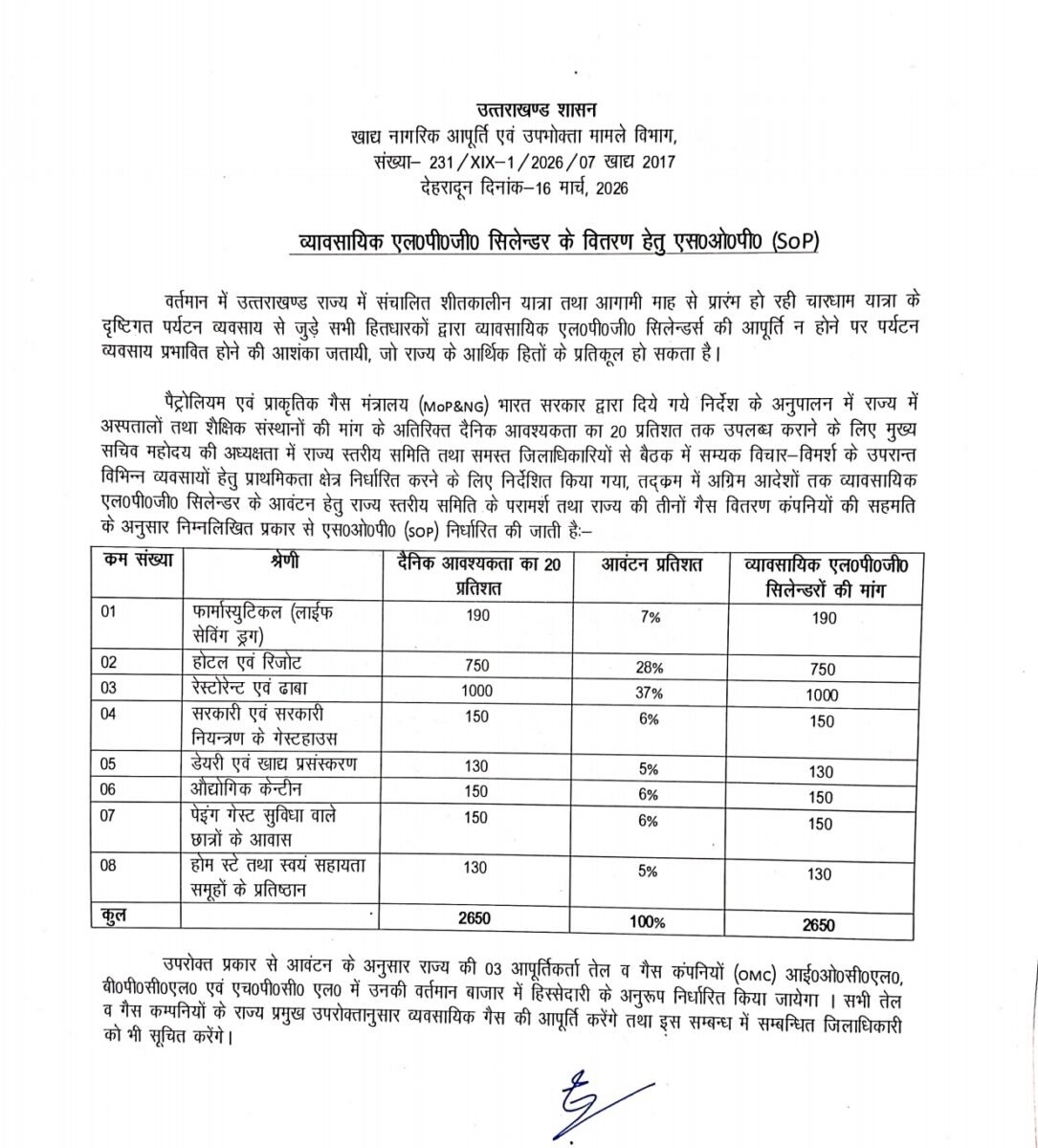 वर्तमान में उत्तराखण्ड राज्य में संचालित शीतकालीन यात्रा तथा आगामी माह से प्रारंभ हो रही चारधाम यात्रा के दृष्टिगत पर्यटन व्यवसाय से जुड़े सभी हितधारकों द्वारा व्यावसायिक एल०पी०जी० सिलेन्डर्स की आपूर्ति न होने पर पर्यटन व्यवसाय प्रभावित होने की आशंका जतायी, जो राज्य के आर्थिक हितों के प्रतिकूल हो सकता है।
