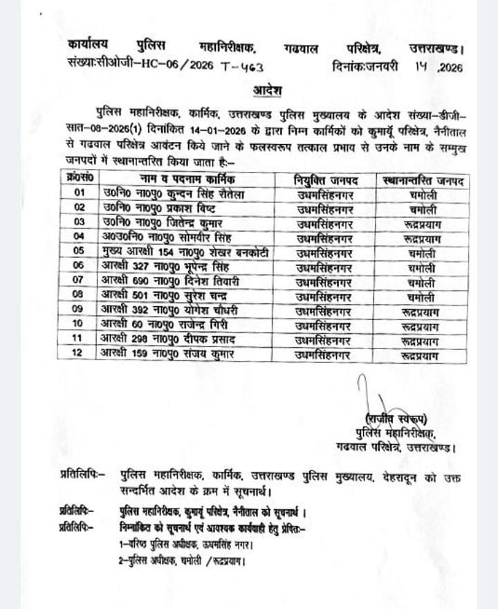 निष्पक्ष जांच सुनिश्चित करने के लिए 12 पुलिस कर्मियों का तत्काल गढ़वाल रेंज के जनपद चमोली और रुद्रप्रयाग किया गया स्थानान्तरण