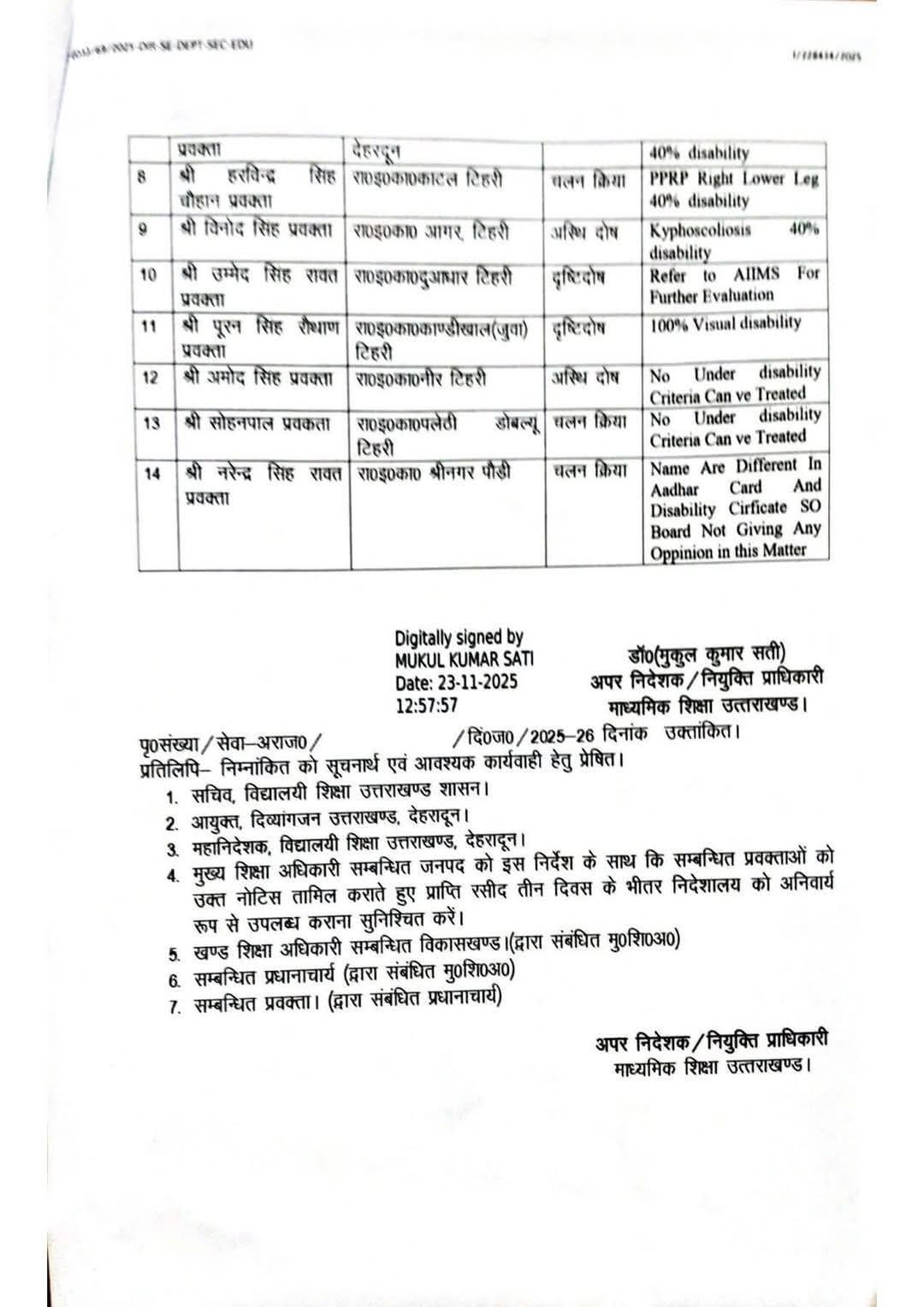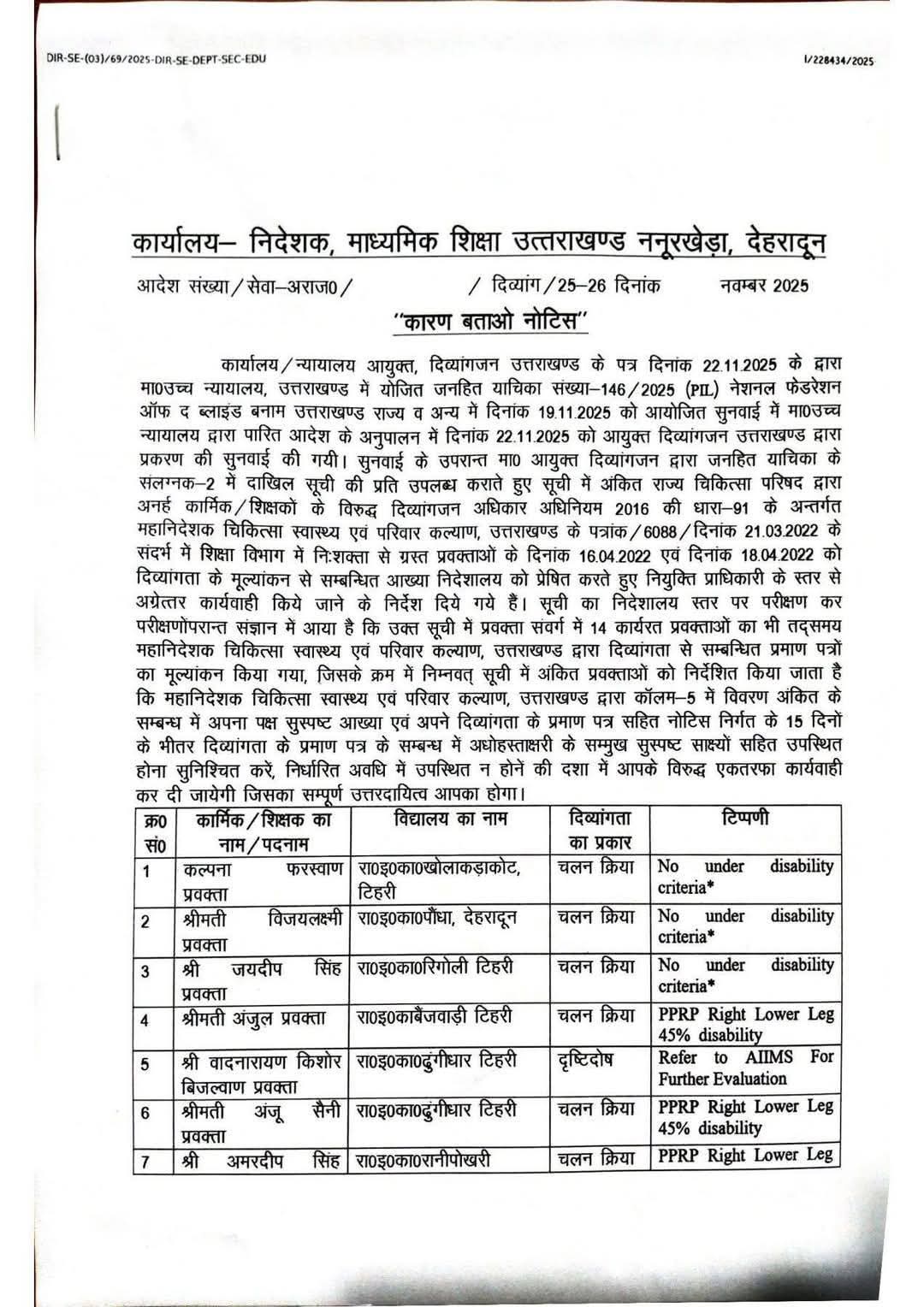 कार्यालय / न्यायालय आयुक्त, दिव्यांगजन उत्तराखण्ड के पत्र दिनांक 22.11.2025 के द्वारा मा०उच्च न्यायालय, उत्तराखण्ड में योजित जनहित याचिका संख्या-146/2025 (PIL) नेशनल फेडरेशन ऑफ द ब्लाइंड बनाम उत्तराखण्ड राज्य व अन्य में दिनांक 19.11.2025 को आयोजित सुनवाई में मा० उच्च न्यायालय द्वारा पारित आदेश के अनुपालन में दिनांक 22.11.2025 को आयुक्त दिव्यांगजन उत्तराखण्ड द्वारा प्रकरण की सुनवाई की गयी। सुनवाई के उपरान्त मा० आयुक्त दिव्यांगजन द्वारा जनहित याचिका के संलग्नक-2 में दाखिल सूची की प्रति उपलब्ध कराते हुए सूची में अंकित राज्य चिकित्सा परिषद द्वारा अनर्ह कार्मिक / शिक्षकों के विरुद्ध दिव्यांगजन अधिकार अधिनियम 2016 की धारा-91 के अन्तर्गत महानिदेशक चिकित्सा स्वास्थ्य एवं परिवार कल्याण, उत्तराखण्ड के पत्रांक/6088/दिनांक 21.03.2022 के संदर्भ में शिक्षा विभाग में निःशक्ता से ग्रस्त प्रवक्ताओं के दिनांक 16.04.2022 एवं दिनांक 18.04.2022 को दिव्यांगता के मूल्यांकन से सम्बन्धित आख्या निदेशालय को प्रेषित करते हुए नियुक्ति प्राधिकारी के स्तर से अग्रेत्तर कार्यवाही किये जाने के निर्देश दिये गये हैं। सूची का निदेशालय स्तर पर परीक्षण कर परीक्षणोपरान्त संज्ञान में आया है कि उक्त सूची में प्रवक्ता संवर्ग में 14 कार्यरत प्रवक्ताओं का भी तद्समय महानिदेशक चिकित्सा स्वास्थ्य एवं परिवार कल्याण, उत्तराखण्ड द्वारा दिव्यांगता से सम्बन्धित प्रमाण पत्रों का मूल्यांकन किया गया, जिसके क्रम में निम्नवत् सूची में अंकित प्रवक्ताओं को निर्देशित किया जाता है कि महानिदेशक चिकित्सा स्वास्थ्य एवं परिवार कल्याण, उत्तराखण्ड द्वारा कॉलम 5 में विवरण अंकित के सम्बन्ध में अपना पक्ष सुस्पष्ट आख्या एवं अपने दिव्यांगता के प्रमाण पत्र सहित नोटिस निर्गत के 15 दिनों के भीतर दिव्यांगता के प्रमाण पत्र के सम्बन्ध में अधोहस्ताक्षरी के सम्मुख सुस्पष्ट साक्ष्यों सहित उपस्थित होना सुनिश्चित करें, निर्धारित अवधि में उपस्थित न होने की दशा में आपके विरुद्ध एकतरफा कार्यवाही कर दी जायेगी जिसका सम्पूर्ण उत्तरदायित्व आपका होगा।