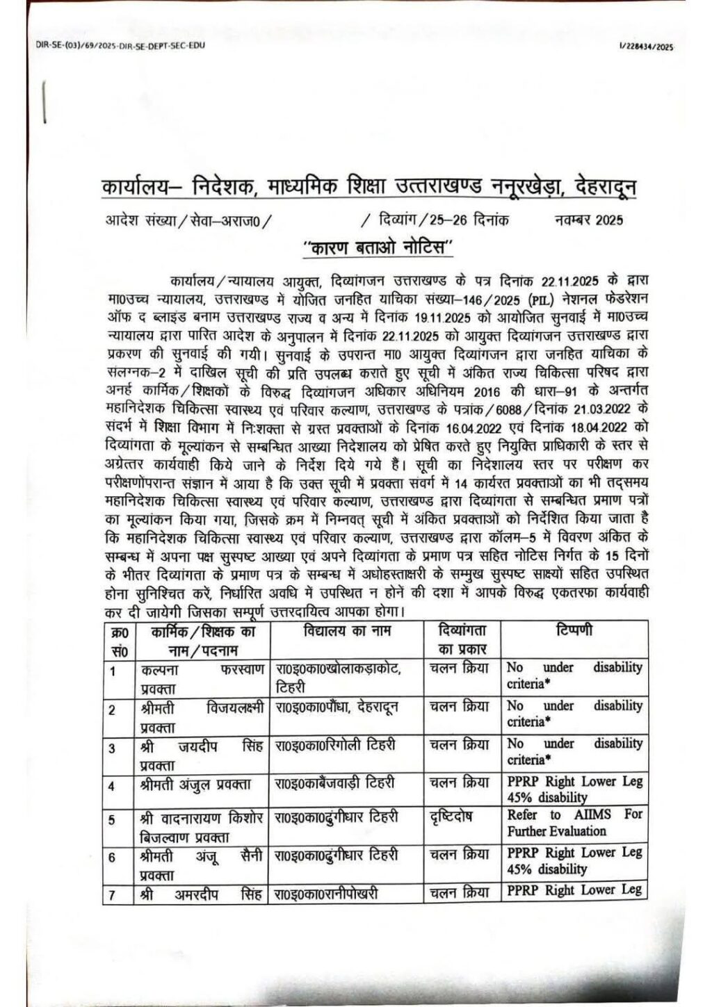कार्यालय / न्यायालय आयुक्त, दिव्यांगजन उत्तराखण्ड के पत्र दिनांक 22.11.2025 के द्वारा मा०उच्च न्यायालय, उत्तराखण्ड में योजित जनहित याचिका संख्या-146/2025 (PIL) नेशनल फेडरेशन ऑफ द ब्लाइंड बनाम उत्तराखण्ड राज्य व अन्य में दिनांक 19.11.2025 को आयोजित सुनवाई में मा० उच्च न्यायालय द्वारा पारित आदेश के अनुपालन में दिनांक 22.11.2025 को आयुक्त दिव्यांगजन उत्तराखण्ड द्वारा प्रकरण की सुनवाई की गयी। सुनवाई के उपरान्त मा० आयुक्त दिव्यांगजन द्वारा जनहित याचिका के संलग्नक-2 में दाखिल सूची की प्रति उपलब्ध कराते हुए सूची में अंकित राज्य चिकित्सा परिषद द्वारा अनर्ह कार्मिक / शिक्षकों के विरुद्ध दिव्यांगजन अधिकार अधिनियम 2016 की धारा-91 के अन्तर्गत महानिदेशक चिकित्सा स्वास्थ्य एवं परिवार कल्याण, उत्तराखण्ड के पत्रांक/6088/दिनांक 21.03.2022 के संदर्भ में शिक्षा विभाग में निःशक्ता से ग्रस्त प्रवक्ताओं के दिनांक 16.04.2022 एवं दिनांक 18.04.2022 को दिव्यांगता के मूल्यांकन से सम्बन्धित आख्या निदेशालय को प्रेषित करते हुए नियुक्ति प्राधिकारी के स्तर से अग्रेत्तर कार्यवाही किये जाने के निर्देश दिये गये हैं। सूची का निदेशालय स्तर पर परीक्षण कर परीक्षणोपरान्त संज्ञान में आया है कि उक्त सूची में प्रवक्ता संवर्ग में 14 कार्यरत प्रवक्ताओं का भी तद्समय महानिदेशक चिकित्सा स्वास्थ्य एवं परिवार कल्याण, उत्तराखण्ड द्वारा दिव्यांगता से सम्बन्धित प्रमाण पत्रों का मूल्यांकन किया गया, जिसके क्रम में निम्नवत् सूची में अंकित प्रवक्ताओं को निर्देशित किया जाता है कि महानिदेशक चिकित्सा स्वास्थ्य एवं परिवार कल्याण, उत्तराखण्ड द्वारा कॉलम 5 में विवरण अंकित के सम्बन्ध में अपना पक्ष सुस्पष्ट आख्या एवं अपने दिव्यांगता के प्रमाण पत्र सहित नोटिस निर्गत के 15 दिनों के भीतर दिव्यांगता के प्रमाण पत्र के सम्बन्ध में अधोहस्ताक्षरी के सम्मुख सुस्पष्ट साक्ष्यों सहित उपस्थित होना सुनिश्चित करें, निर्धारित अवधि में उपस्थित न होने की दशा में आपके विरुद्ध एकतरफा कार्यवाही कर दी जायेगी जिसका सम्पूर्ण उत्तरदायित्व आपका होगा।
