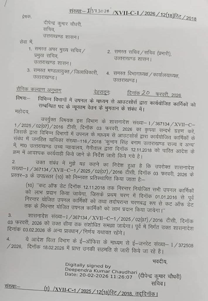 उपर्युक्त विषयक इस विभाग के शासनादेश संख्या-1/367134/XVII-C-1/2025/02(07)/2016 टीसी, दिनॉक 03 फरवरी, 2026 का कृपया सन्दर्भ ग्रहण करें, जिसके द्वारा विभिन्न विभागों में उपनल के माध्यम से आउटसोर्स द्वारा कार्ययोजित कार्मिकों के संबंध में जनहित याचिका संख्या-116/2018 ‘कुन्दन सिंह बनाम उत्तराखण्ड राज्य व अन्य में, मा० उत्तराखण्ड उच्च न्यायालय, नैनीताल द्वारा दिनाँक 12.11.2018 को पारित आदेश के क्रम में आवश्यक कार्यवाही किये जाने के निर्देश जारी किये गये है।