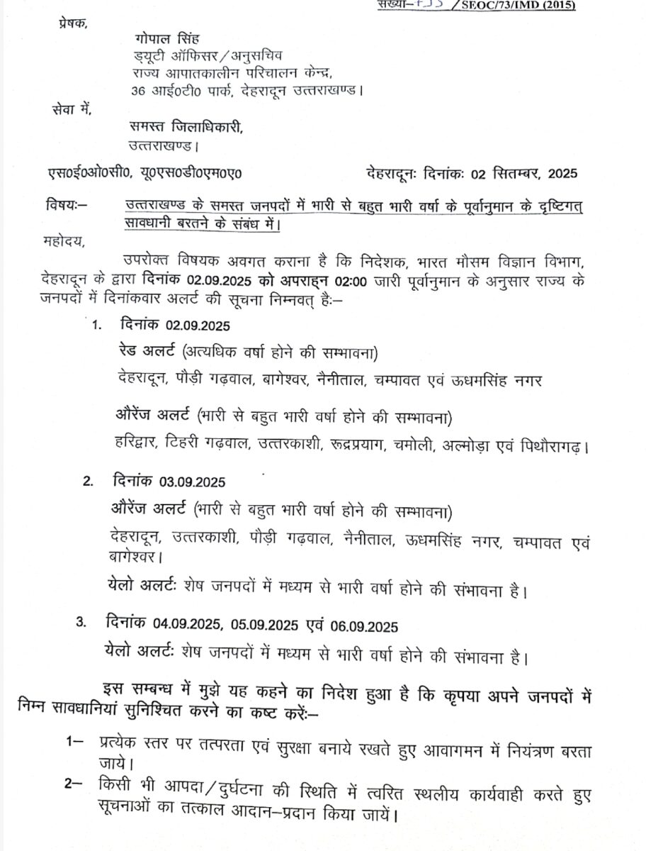 दिनांक 03.09.2025 औरेंज अलर्ट (भारी से बहुत भारी वर्षा होने की सम्भावना) देहरादून, उत्तरकाशी, पौड़ी गढ़वाल, नैनीताल, ऊधमसिंह नगर, चम्पावत एवं बागेश्वर । येलो अलर्टः शेष जनपदों में मध्यम से भारी वर्षा होने की संभावना है।