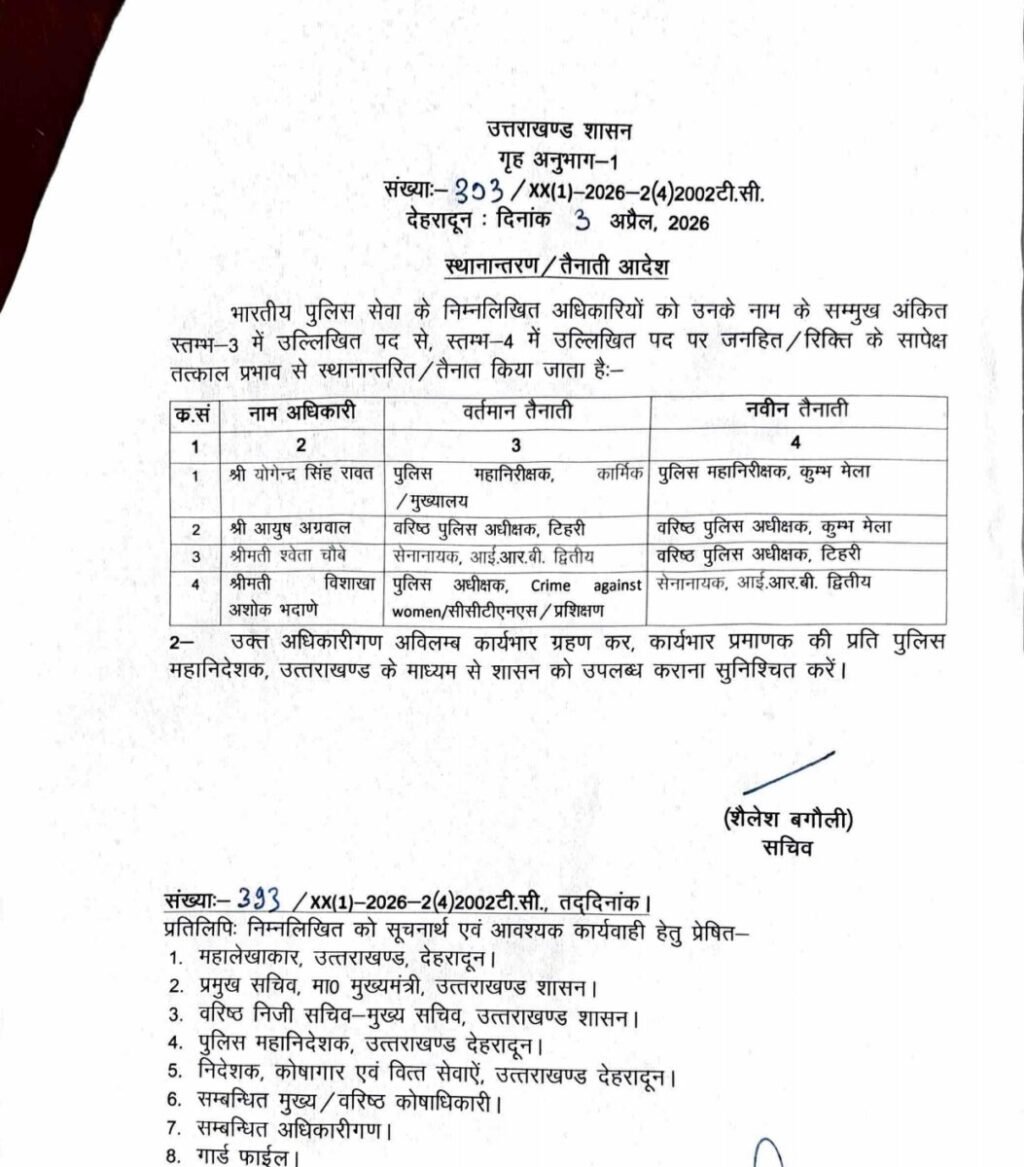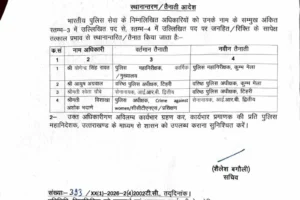 भारतीय पुलिस सेवा के निम्नलिखित अधिकारियों को उनके नाम के सम्मुख अंकित स्तम्भ-3 में उल्लिखित पद से, स्तम्भ 4 में उल्लिखित पद पर जनहित/ रिक्ति के सापेक्ष तत्काल प्रभाव से स्थानान्तरित / तैनात किया जाता है:-