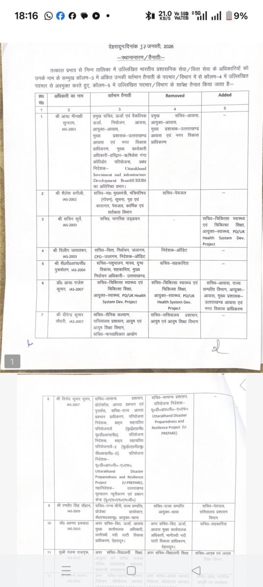 IAS संवर्ग में प्रमुख स्तर पर बदलाव किए गए हैं। वर्ष 2001 बैच के अधिकारी श्री आर. मीनाक्षी सुन्दरम से प्रमुख सचिव ऊर्जा, नियोजन सहित अन्य अतिरिक्त प्रभार हटाते हुए उन्हें प्रमुख सचिव आवास, आयुक्त आवास एवं मुख्य प्रशासक उत्तराखण्ड आवास एवं नगर विकास प्राधिकरण की जिम्मेदारी दी गई है।