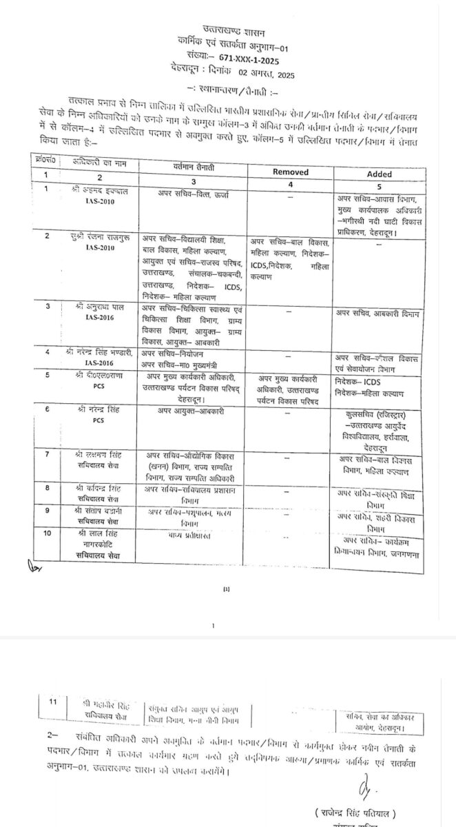 तत्काल प्रभाव से निम्न तालिका में उल्लिखित भारतीय प्रशारानिक रोना/प्रान्तीय सिनिल रोत्रा / सचिवालय सेवा के निन्न अधिकारियों को उनके नाम के सम्मुख कॉलम-3 में अंकित उनकी वर्तमान तैनाती के पदभार /विभाग में से कॉलम १ में उल्लिखित पदभार से अवमुक्त करते हुए, कॉलग-5 में उल्लिखित पदभार/विभाग में तेनात किया जाता है:-