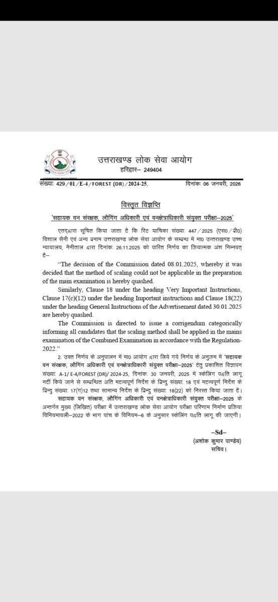 - उक्त निर्णय के अनुपालन में मा० आयोग द्वारा लिये गये निर्णय के अनुक्रम में ‘सहायक वन संरक्षक, लौगिंग अधिकारी एवं वनक्षेत्राधिकारी संयुक्त परीक्षा-2025’ हेतु प्रकाशित विज्ञापन संख्या. A-1/E-4/FOREST (DR)/2024-25, दिनांक 30 जनवरी, 2025 में स्केलिंग पद्धति लागू नहीं किये जाने से सम्बन्धित अति महत्वपूर्ण निर्देश के बिन्दु संख्याः 18 एवं महत्वपूर्ण निर्देश के बिन्दु संख्याः 17 (ग) 12 तथा सामान्य निर्देश के बिन्दु संख्याः 18 (22) को निरस्त किया जाता है।