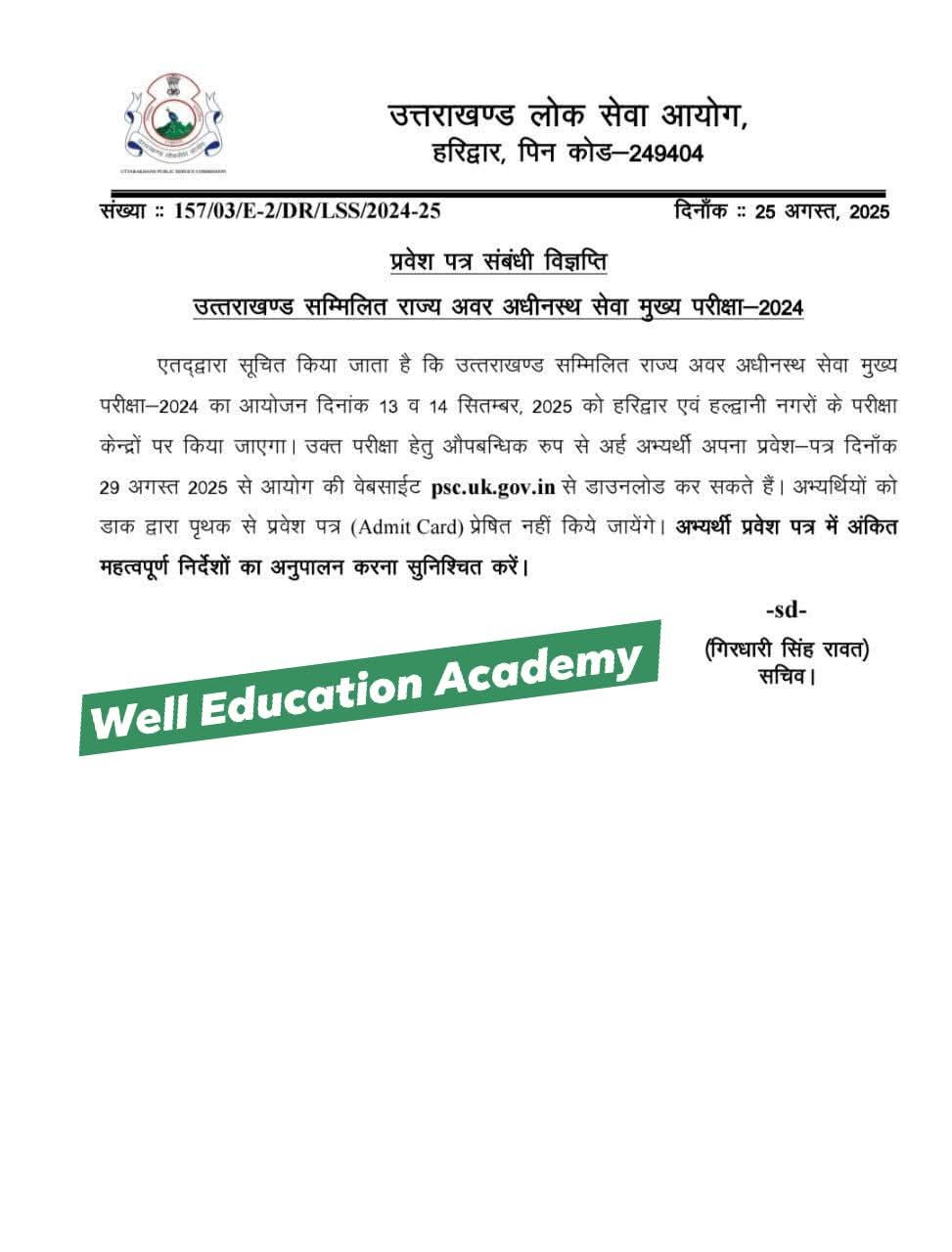 एतद्वारा सूचित किया जाता है कि उत्तराखण्ड सम्मिलित राज्य अवर अधीनस्थ सेवा मुख्य परीक्षा-2024 का आयोजन दिनांक 13 व 14 सितम्बर, 2025 को हरिद्वार एवं हल्द्वानी नगरों के परीक्षा केन्द्रों पर किया जाएगा। उक्त परीक्षा हेतु औपबन्धिक रुप से अर्ह अभ्यर्थी अपना प्रवेश-पत्र दिनाँक 29 अगस्त 2025 से आयोग की वेबसाईट psc.uk.gov.in से डाउनलोड कर सकते हैं। अभ्यर्थियों को डाक द्वारा पृथक से प्रवेश पत्र (Admit Card) प्रेषित नहीं किये जायेंगे। अभ्यर्थी प्रवेश पत्र में अंकित महत्वपूर्ण निर्देशों का अनुपालन करना सुनिश्चित करें।