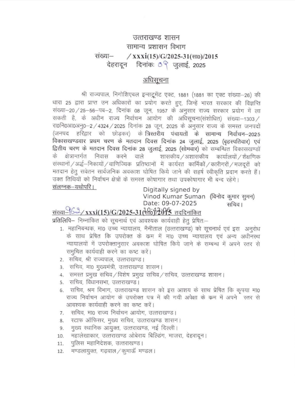 श्री राज्यपाल, निगोशिएबल इन्सट्रूमेंट एक्ट, 1881 (1881 का एक्ट संख्या-26) की धारा 25 द्वारा प्राप्त उन अधिकारों का प्रयोग करते हुए, जिन्हें भारत सरकार की विज्ञप्ति संख्या-20/25-56-पब-2, दिनांक 08 जून, 1957 के अनुसार राज्य सरकार प्रयोग में ला सकती है. के अधीन राज्य निर्वाचन आयोग की अधिसूचना (संशोधित) संख्या-1303/रा०नि०आ०अनु०-2/4324/2025 दिनांक 28 जून, 2025 के अनुसार राज्य के समस्त जनपदों (जनपद हरिद्वार को छोड़कर) के त्रिस्तरीय पंचायतों के सामान्य निर्वाचन-2025 विकासखण्डवार प्रथम चरण के मतदान दिवस दिनांक 24 जुलाई, 2025 (बृहस्पतिवार) एवं द्वितीय चरण के मतदान दिवस दिनांक 28 जुलाई, 2025 (सोमवार) को सम्बन्धित विकासखण्डों के क्षेत्रान्तर्गत निवास करने वाले शासकीय/अशासकीय कार्यालयों/शैक्षणिक संस्थानों/अर्द्ध-निकायों/वाणिज्यिक प्रतिष्ठानों में कार्यरत कार्मिकों/कारीगरों/मजदूरों को मतदान हेतु सवेतन सार्वजनिक अवकाश घोषित किये जाने की सहर्ष स्वीकृति प्रदान करते हैं। उक्त तिथियों को निर्वाचन क्षेत्रों के समस्त कोषागार तथा उपकोषागार भी बन्द रहेंगे।
