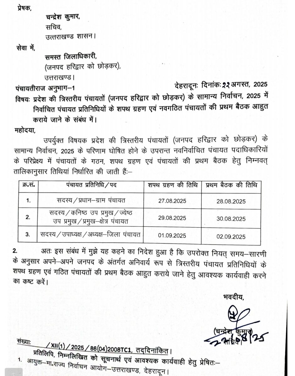 प्रदेश की त्रिस्तरीय पंचायतों (जनपद हरिद्वार को छोड़कर) के सामान्य निर्वाचन, 2025 में निर्वाचित पंचायत प्रतिनिधियों के शपथ ग्रहण एवं नवगठित पंचायतों की प्रथम बैठक आहुत कराये जाने के संबंध में।
