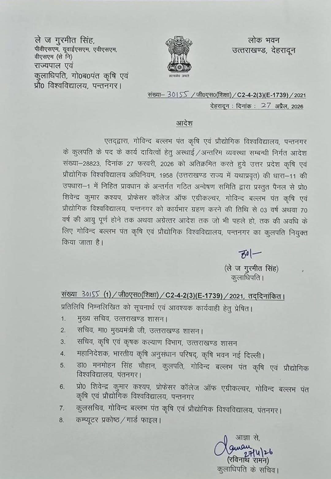 एतद्द्वारा, गोविन्द बल्लभ पंत कृषि एवं प्रौद्योगिक विश्वविद्यालय, पन्तनगर के कुलपति के पद के कार्य दायित्वों हेतु अस्थाई / अन्तरिम व्यवस्था सम्बन्धी निर्गत आदेश संख्या-28823, दिनांक 27 फरवरी, 2026 को अतिक्रमित करते हुये उत्तर प्रदेश कृषि एवं प्रौद्योगिक विश्वविद्यालय अधिनियम, 1958 (उत्तराखण्ड राज्य में यथाप्रवृत) की धारा-11 की उपधारा-1 में निहित प्रावधान के अन्तर्गत गठित अन्वेषण समिति द्वारा प्रस्तुत पैनल से प्रो० शिवेन्द्र कुमार कश्यप, प्रोफेसर कॉलेज ऑफ एग्रीकल्चर, गोविन्द बल्लभ पंत कृषि एवं प्रौद्योगिक विश्वविद्यालय, पन्तनगर को कार्यभार ग्रहण करने की तिथि से 03 वर्ष अथवा 70 वर्ष की आयु पूर्ण होने तक अथवा अग्रेत्तर आदेश तक जो भी पहले हो, तक की अवधि के लिए गोविन्द बल्लभ पंत कृषि एवं प्रौद्योगिक विश्वविद्यालय, पन्तनगर का कुलपति नियुक्त किया जाता है।