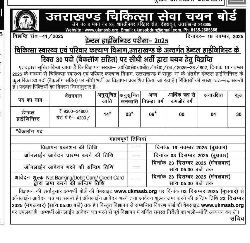 दंत चिकित्सकों के 30 बैकलॉग पदों पर भर्ती प्रक्रिया शुरू कर दी गई। इसमें अनारक्षित वर्ग के चार, अनुसूचित जाति 14, अनुसूचित जनजाति तीन व अन्य पिछड़ा वर्ग नौ पद शामिल हैं। इन पदों के लिए ऑनलाइन आवेदन तीन से 23 दिसंबर तक कर सकते हैं। स्वास्थ्य मंत्री डॉ. धन सिंह रावत ने कहा, स्वास्थ्य व चिकित्सा शिक्षा विभाग में खाली पदों पर भर्ती करना सरकार की प्राथमिकता है। इससे – अस्पतालों में सेवाएं सुदृढ़ होंगी और लोगों को बेहतर – चिकित्सा सुविधा मिलेगी।