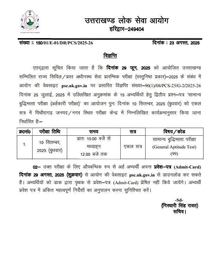 एतद्वारा सूचित किया जाता है कि दिनांक 29 जून, 2025 को आयोजित उत्तराखण्ड सम्मिलित राज्य सिविल / प्रवर अधीनस्थ सेवा प्रारम्भिक परीक्षा (वस्तुनिष्ठ प्रकार) -2025 के संबंध में आयोग की वेबसाइट psc.uk.gov.in पर प्रसारित विज्ञप्ति संख्या-90(1)/08/PCS-25/G-2/2025-26 दिनांक 25 जुलाई, 2025 में उल्लिखित अनुक्रमांक के 15 अभ्यर्थियों हेतु द्वितीय प्रश्न-पत्र ‘सामान्य बुद्धिमत्ता परीक्षा (अर्हकारी परीक्षा)’ का आयोजन पुनः दिनांक 10 सितम्बर, 2025 (बुधवार) को एकल सत्र में पिथौरागढ़ जनपद / नगर स्थित परीक्षा केन्द्र में निम्नलिखित कार्यक्रमानुसार किया जाना निर्धारित हैः-
