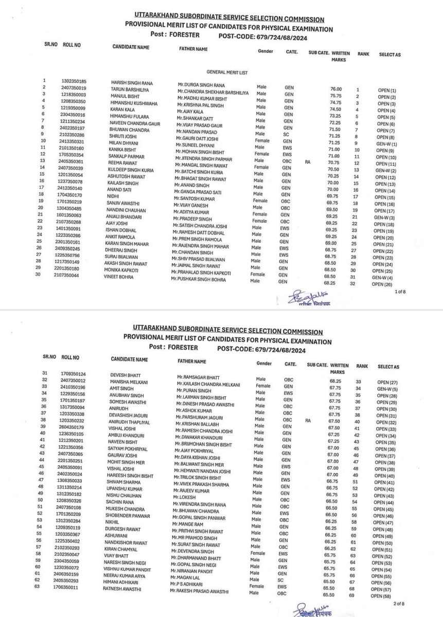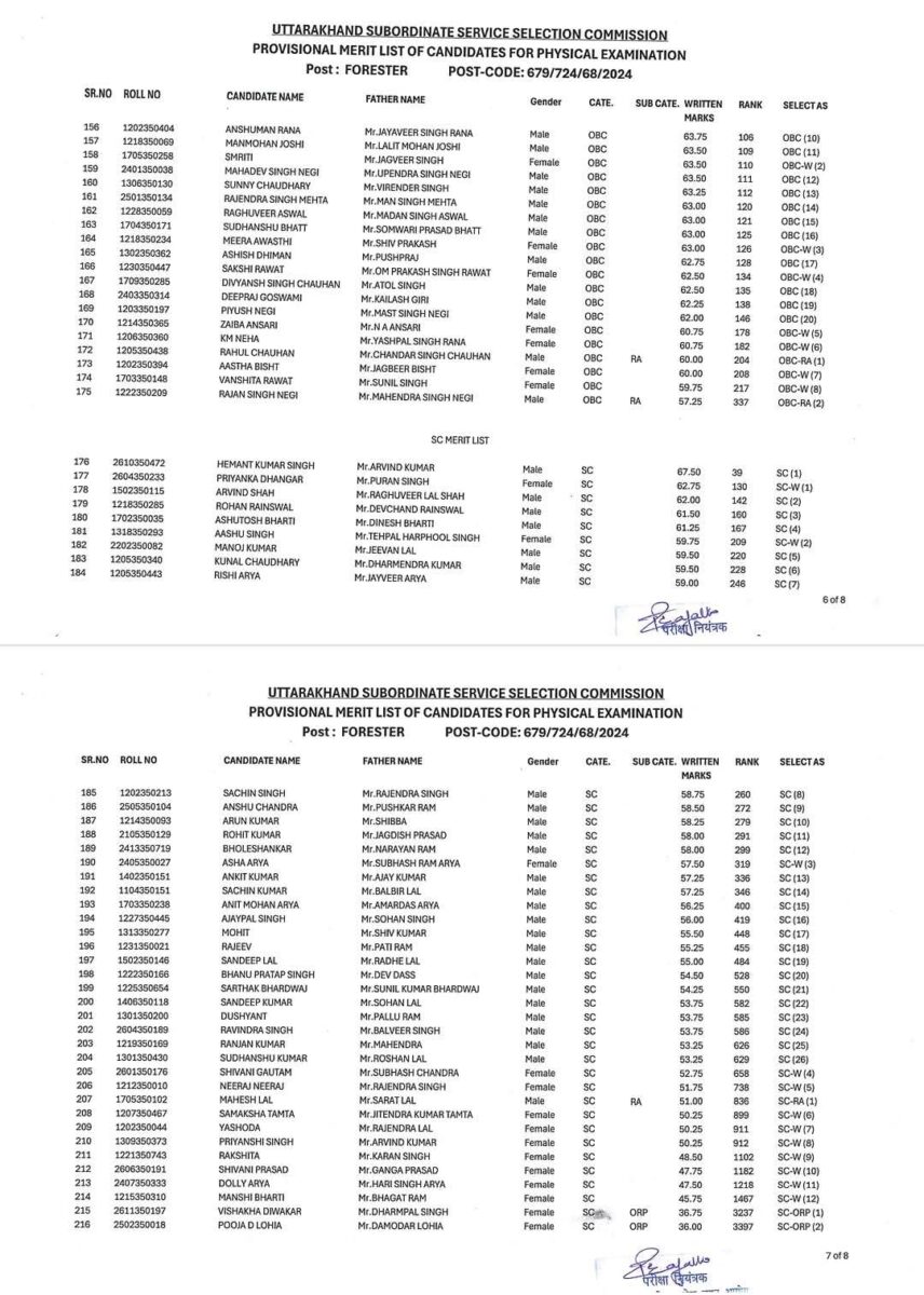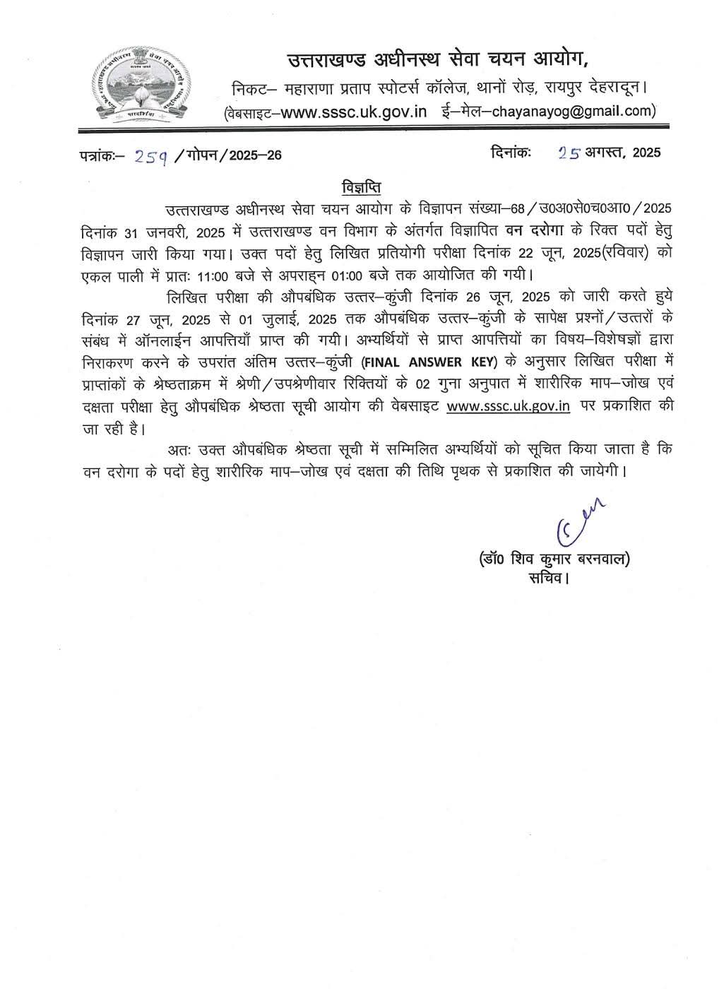 लिखित परीक्षा की औपबंधिक उत्तर-कुंजी दिनांक 26 जून, 2025 को जारी करते हुये दिनांक 27 जून, 2025 से 01 जुलाई, 2025 तक औपबंधिक उत्तर कुंजी के सापेक्ष प्रश्नों / उत्तरों के संबंध में ऑनलाईन आपत्तियाँ प्राप्त की गयी। अभ्यर्थियों से प्राप्त आपत्तियों का विषय-विशेषज्ञों द्वारा निराकरण करने के उपरांत अंतिम उत्तर कुंजी (FINAL ANSWER KEY) के अनुसार लिखित परीक्षा में प्राप्तांकों के श्रेष्ठताक्रम में श्रेणी/ उपश्रेणीवार रिक्तियों के 02 गुना अनुपात में शारीरिक माप-जोख एवं दक्षता परीक्षा हेतु औपबंधिक श्रेष्ठता सूची आयोग की वेबसाइट www.sssc.uk.gov.in पर प्रकाशित की जा रही है।