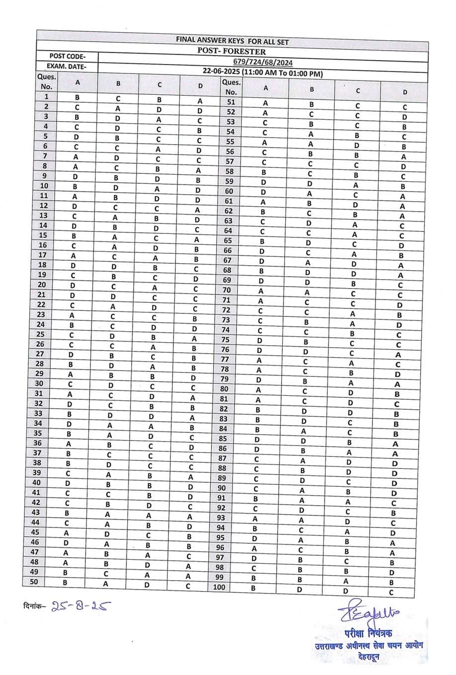 उत्तराखण्ड अधीनस्थ सेवा चयन आयोग के विज्ञापन संख्या-68/ उ०अ० से०च०आ०/2025 दिनांक 31 जनवरी, 2025 में उत्तराखण्ड वन विभाग के अंतर्गत विज्ञापित वन दरोगा के रिक्त पदों हेतु विज्ञापन जारी किया गया। उक्त पदों हेतु लिखित प्रतियोगी परीक्षा दिनांक 22 जून, 2025 (रविवार) को एकल पाली में प्रातः 11:00 बजे से अपराह्न 01:00 बजे तक आयोजित की गयी।