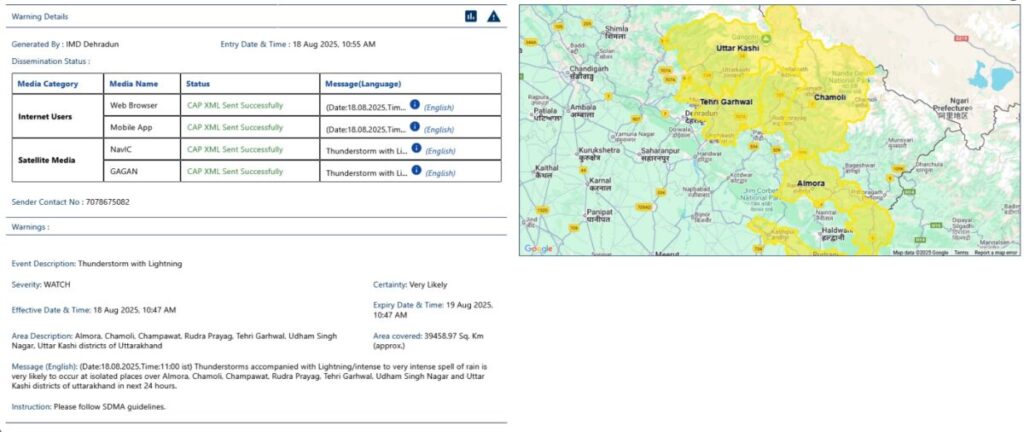 अगले 24 घंटों में ( येलो अलर्ट दिनांक 18.8.2025 10:47 AM बजे से दिनांक 19.8.2025 10:47 AM बजे तक ) जनपद – अल्मोडा, चमोली, चंपावत, रुद्र प्रयाग, टेहरी गढ़वाल, उधम सिंह नगर और उत्तर काशी में अलग-अलग स्थानों पर यथा – केदारनाथ, बद्रीनाथ, गंगोत्री, बड़कोट, जोशीमठ, कर्णप्रयाग, रानीखेत, लाहाघाट, काशीपुर, खटीमा तथा इनके आस पास के छेत्रों मे बिजली कड़कने के साथ गरज के साथ तूफान आने/तेज से लेकर बहुत तेज बारिश होने की संभावना है |