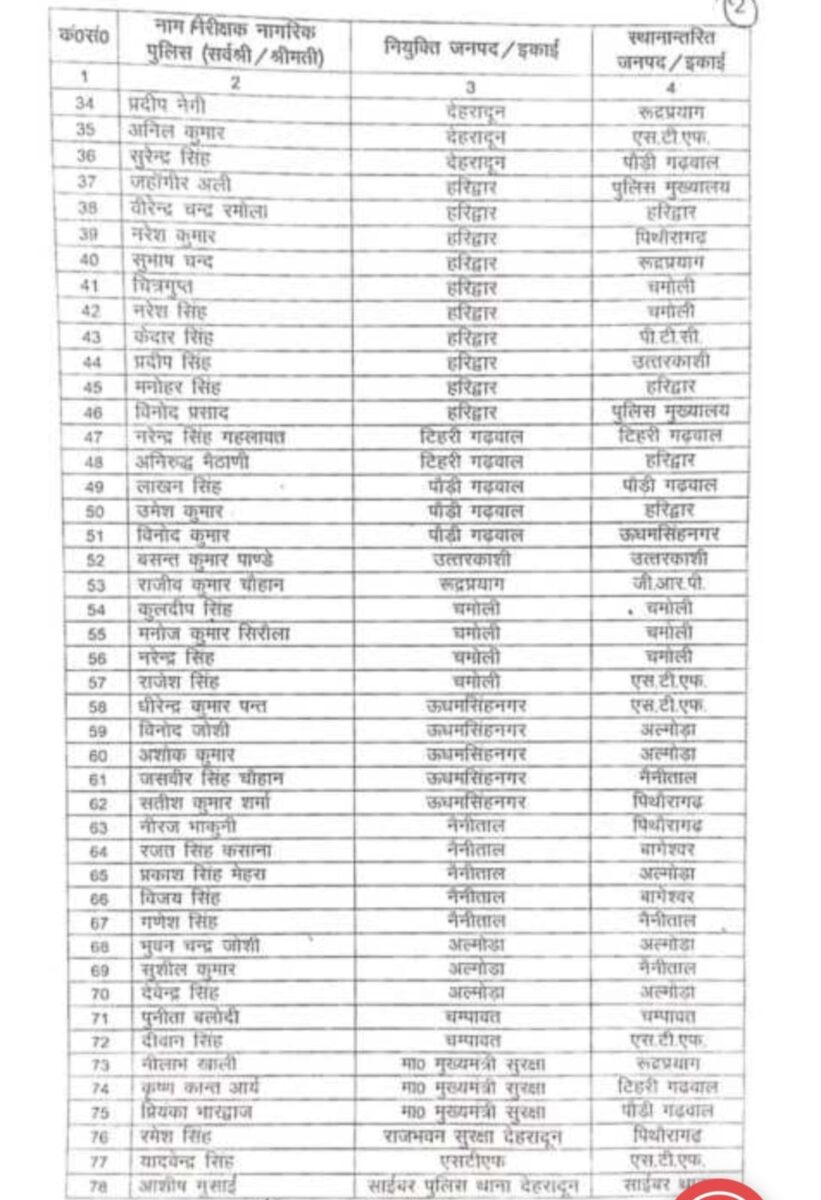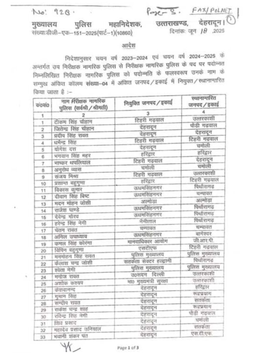 निदेशानुसार चयन वर्ष 2023-2024 एवं चयन वर्ष 2024-2025 के अन्तर्गत उप निरीक्षक नागरिक पुलिस से निरीक्षक नागरिक पुलिस के पद पर पदोन्नत निम्नलिखित निरीक्षक नागरिक पुलिस को पदोन्नति के फलस्वरूप उनके नाम के सम्मुख अंकित कॉलग संख्या-04 में अंकित जनपद/इकाई में नियुक्त/स्थानानारित किया जाता है: